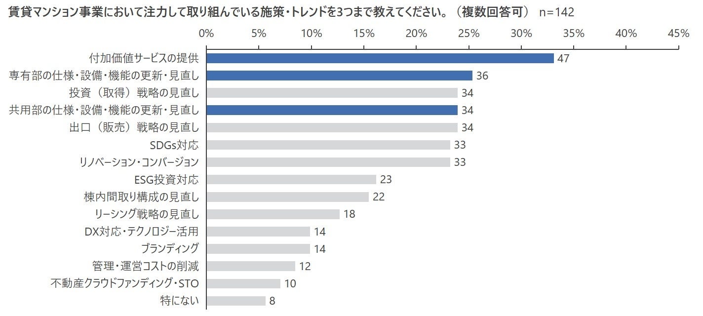 注力している施策やトレンドについては、「付加価値サービスの提供」が最も多く、 「専有部/共用部の仕様・設備・機能の更新・見直し」も引き続き上位となっており、供給過剰との見方もある中で、他物件との差別化に注力しているものと思料され、コメントでも、差別化を目的としたリニューアルや付加価値の創造に関する内容が多く寄せられた結果となりました。