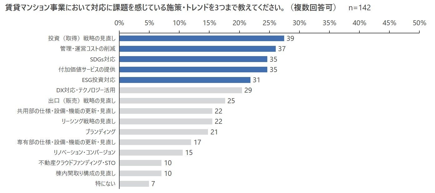賃貸マンション事業の課題としては、「投資(取得)戦略の見直し」が最も多く、「管理・運営コストの削減」が続く結果となっています。用地取得競争が過熱していることや、物価・人件費の高騰が続いていることで、コストが上昇し、賃料との整合性が取りにくくなっているのと、SDGs対応についても、コストはかかるもののその分を賃料に反映できないといった課題もあり、「コストの上昇」が喫緊の課題であると思料される結果となりました。