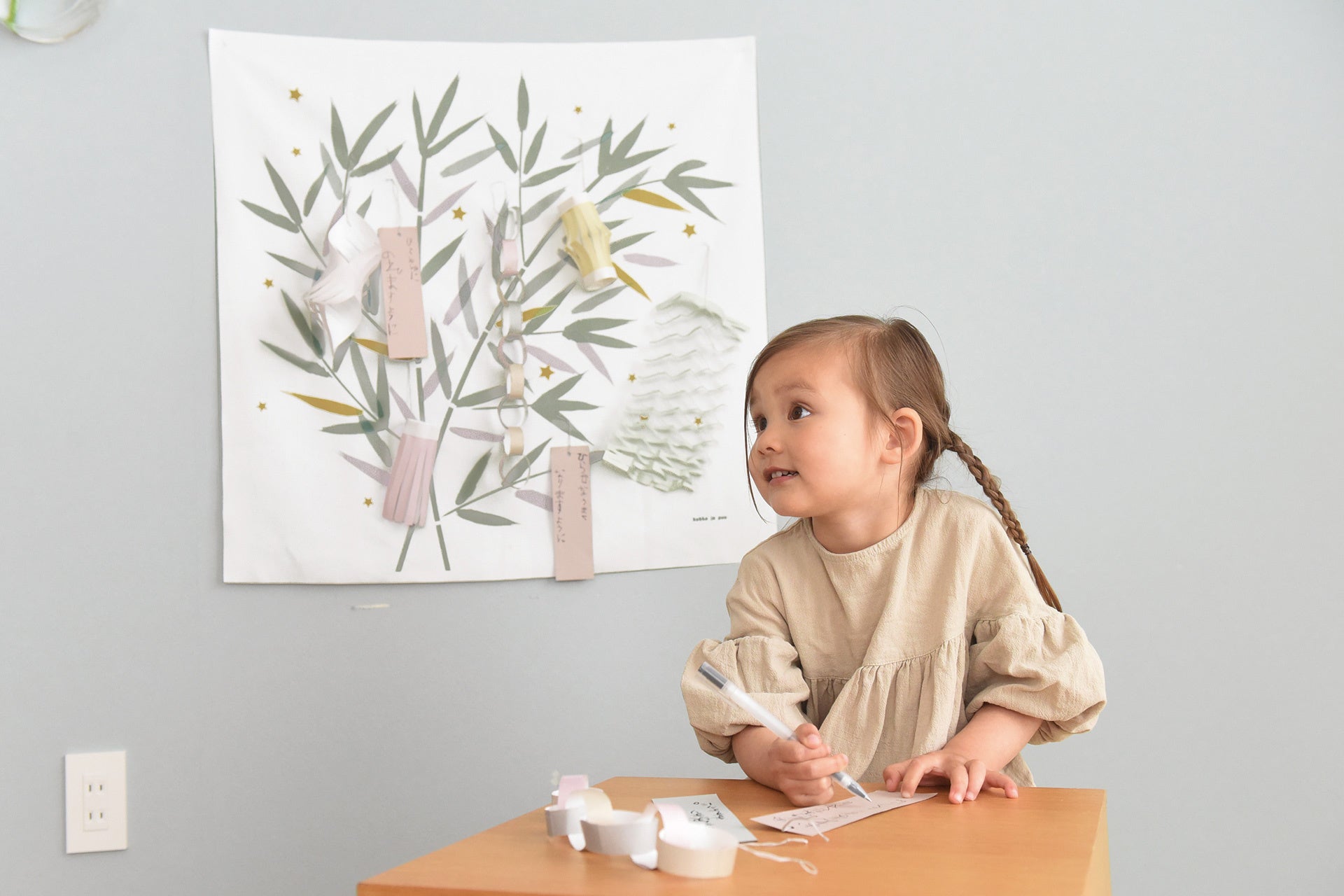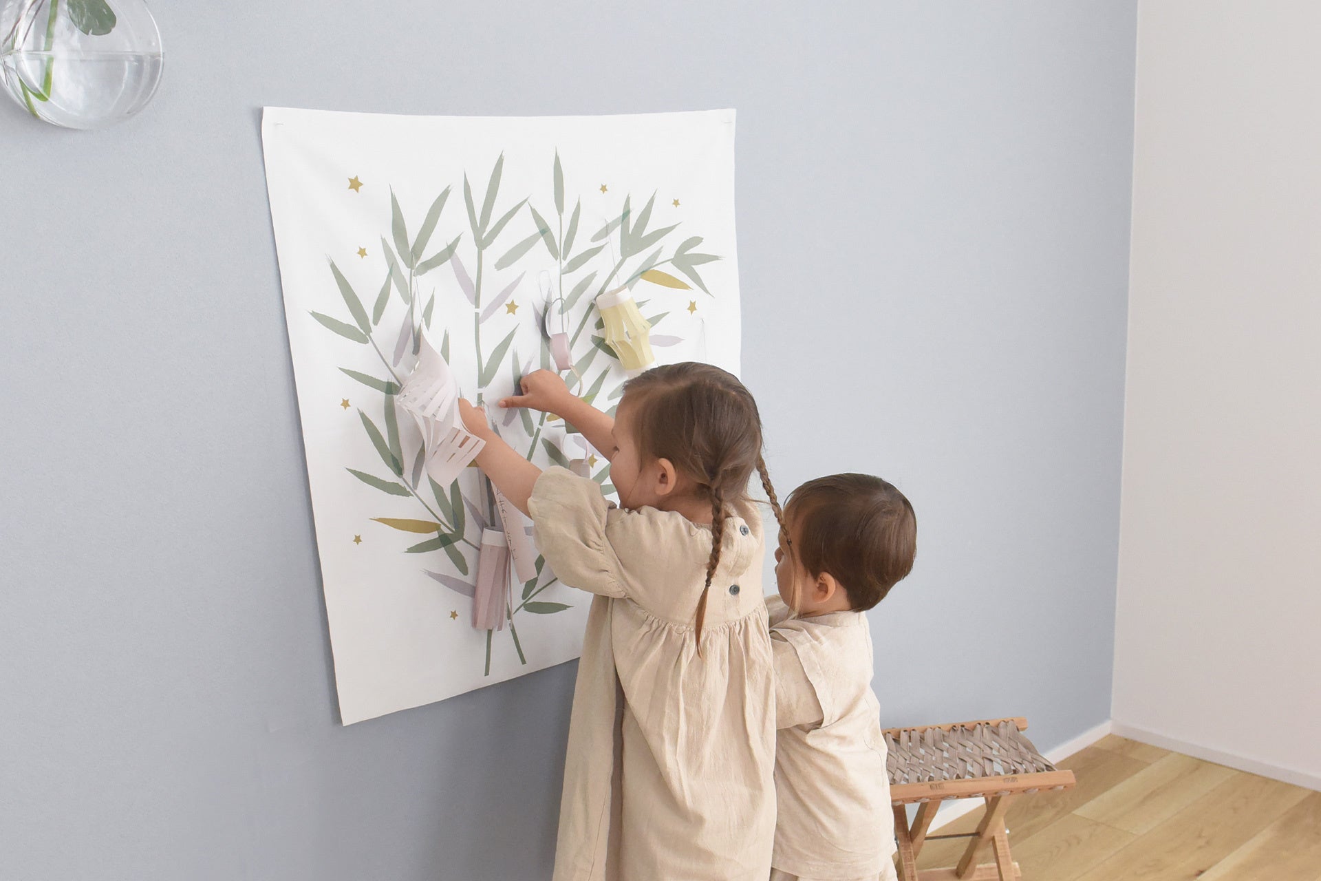 「kukka ja puu 七夕 タペストリー 」は、リビングや玄関など、お家の中でも場所を取らずに、壁に飾るだけで楽しむことができるのが魅力です。折り紙や色画用紙を使って、七夕飾りを作ってタペストリーに貼り付ければ、我が家だけの七夕飾りが完成!