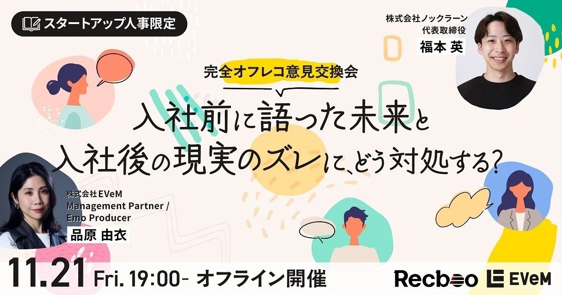 株式会社ノックラーン(東京都大田区、代表取締役:福本英)は、2025年11月21日(金)に、スタートアップ企業に必要なマネジメントトレーニングを提供するEVeM社と共催でスタートアップ人事限定・完全オフレコ意見交換会を開催することをお知らせいたします。