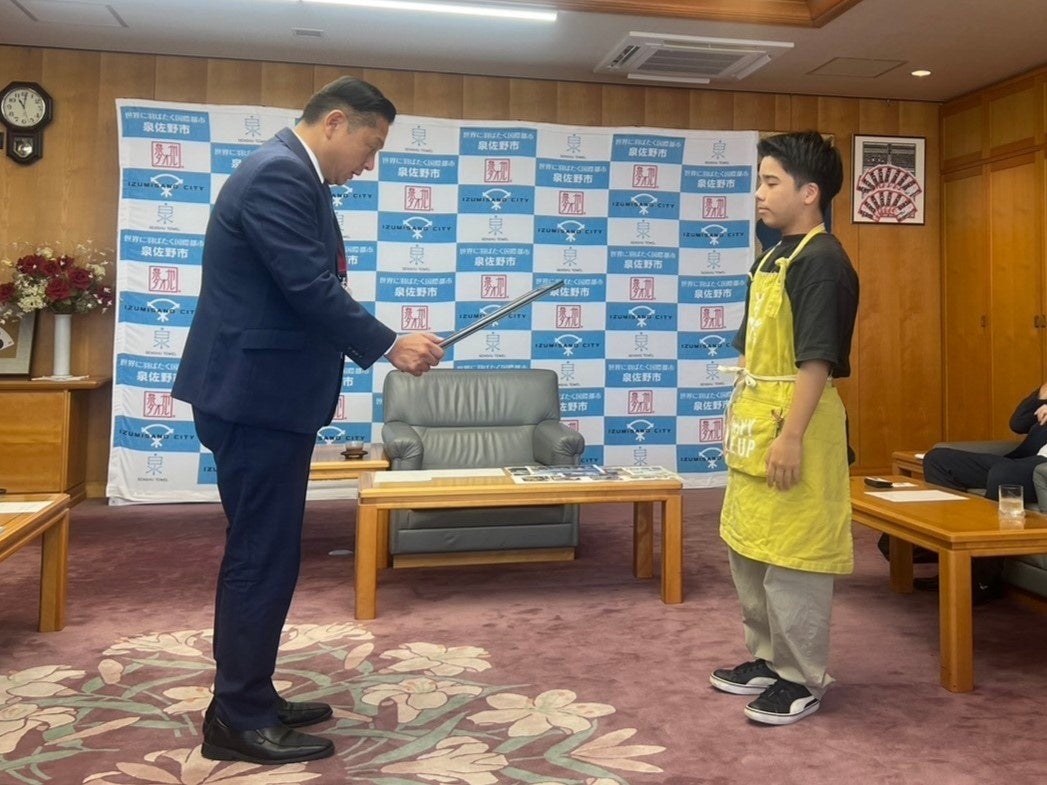 フリースクール「キリンのとびら」の子ども達とスタッフは、2024年9月20日(金)に泉佐野市役所を訪問し、同年8月に被災地・石川県七尾市能登島で開催した子ども食堂の活動について、泉佐野市の千代松大耕市長より感謝状を拝受しました。