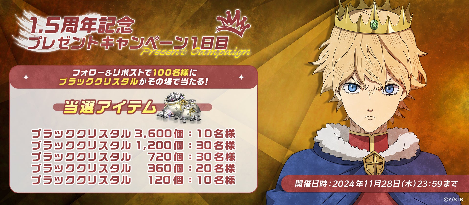 1.5周年を記念して、公式X(旧Twitter)では11/28(木)~12/4(水)までの7日間、フォロー&リポストで毎日100名様にブラッククリスタルが当たるキャンペーンを開催中です。