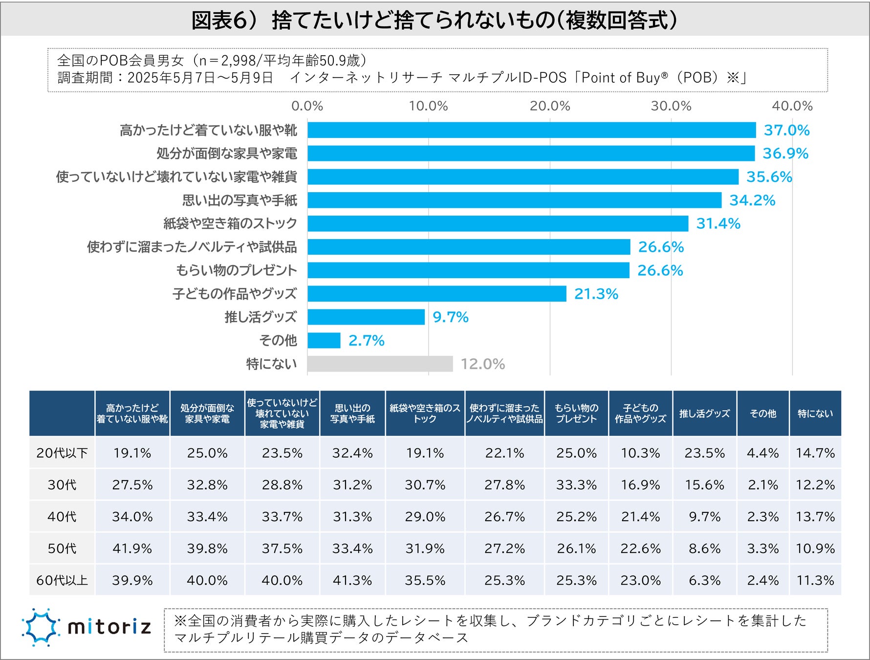 「捨てたいけれど捨てられないもの」について調査したところ、30%を超えた項目は5つありました。最も多かったのは「高かったけど着ていない服や靴」の37.0%で、次いで「処分が面倒な家具や家電」が36.9%、「使っていないけど壊れていない家電や雑貨」が35.6%と、“もったいない”気持ちや“処分の手間”を理由に捨てられないものが上位を占めています。また、「思い出の写真や手紙」(34.2%)や「紙袋・空き箱のストック」(31.4%)といった、感情的・実用的な理由から手放せないものも同程度の割合で並んでいます。年代別でみると20代以下は「推し活グッズ」(23.5%)が突出しており、年代によって「捨てにくさ」の背景が異なる傾向が見られました。一方で「特にない」と回答したのは12.0%にとどまり、多くの人が何かしら捨てたくても捨てられないものを抱えていることがわかりました(図表6)。