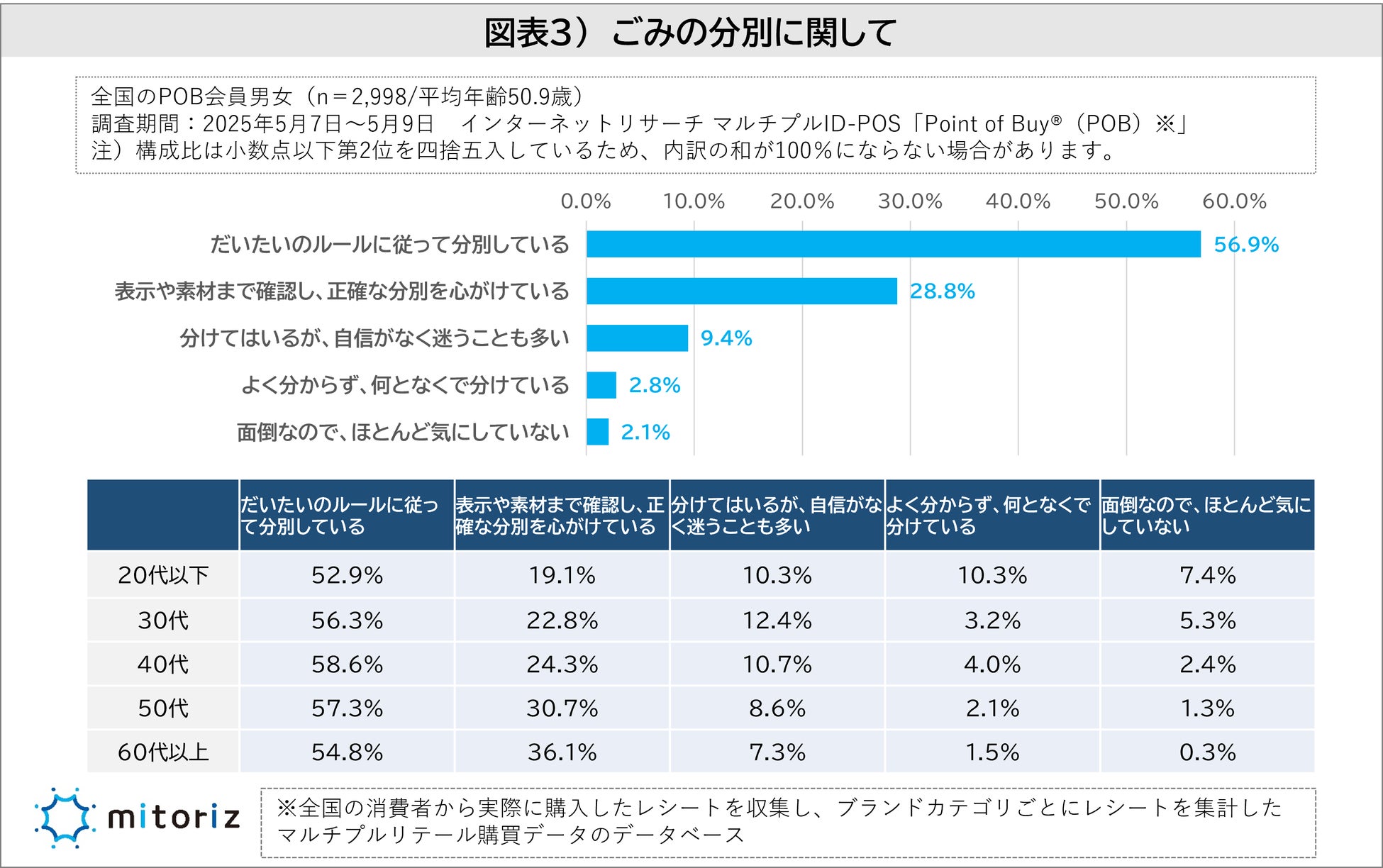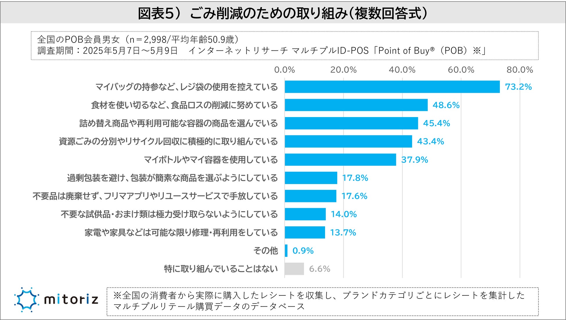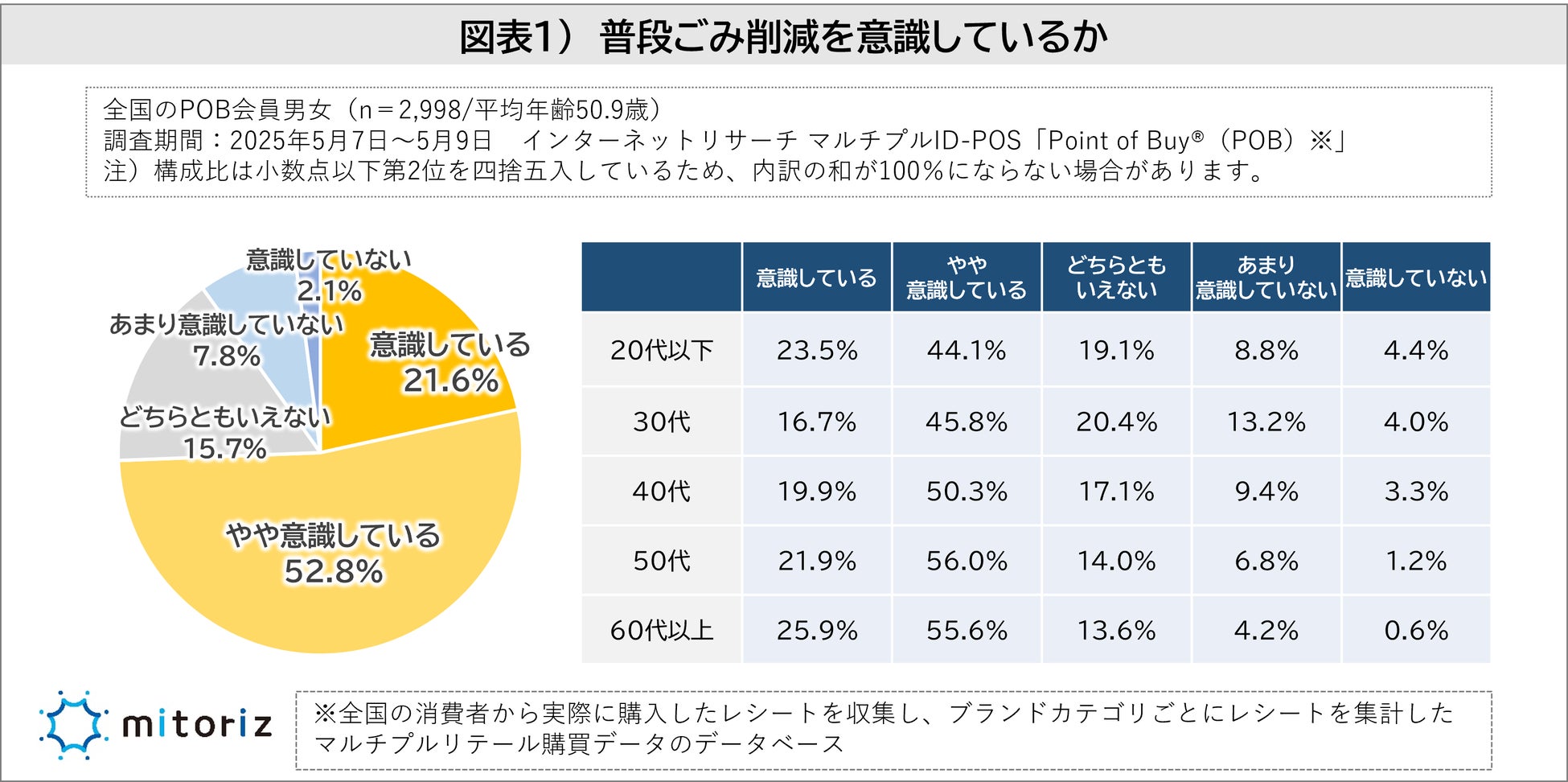 株式会社mitoriz(本社:東京都港区、代表取締役社長:木名瀬博)は、消費者購買行動データサービス「Point of Buy®(以下、POB)」の会員2,998人に「ごみ削減に関する調査」を実施いたしました。