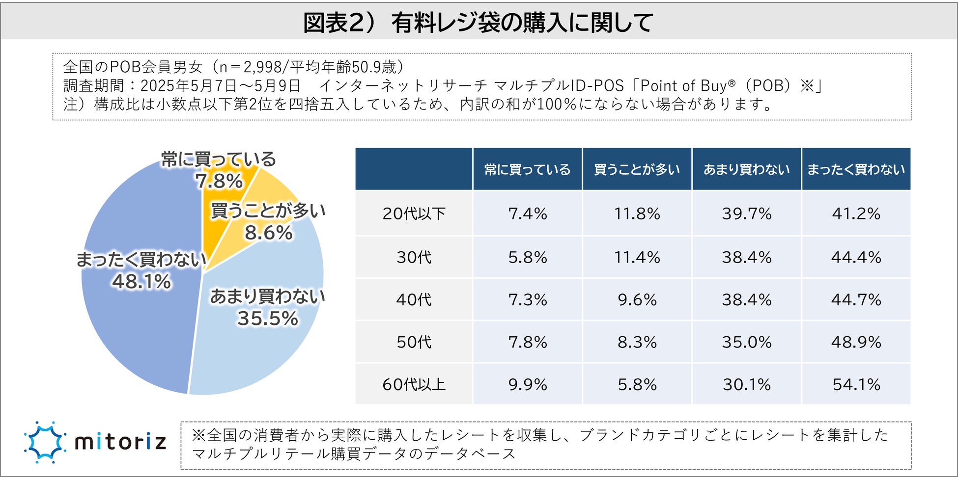 ・有料レジ袋は全年代で「購入しない」が80%を超えており、レジ袋削減の考えが広く浸透