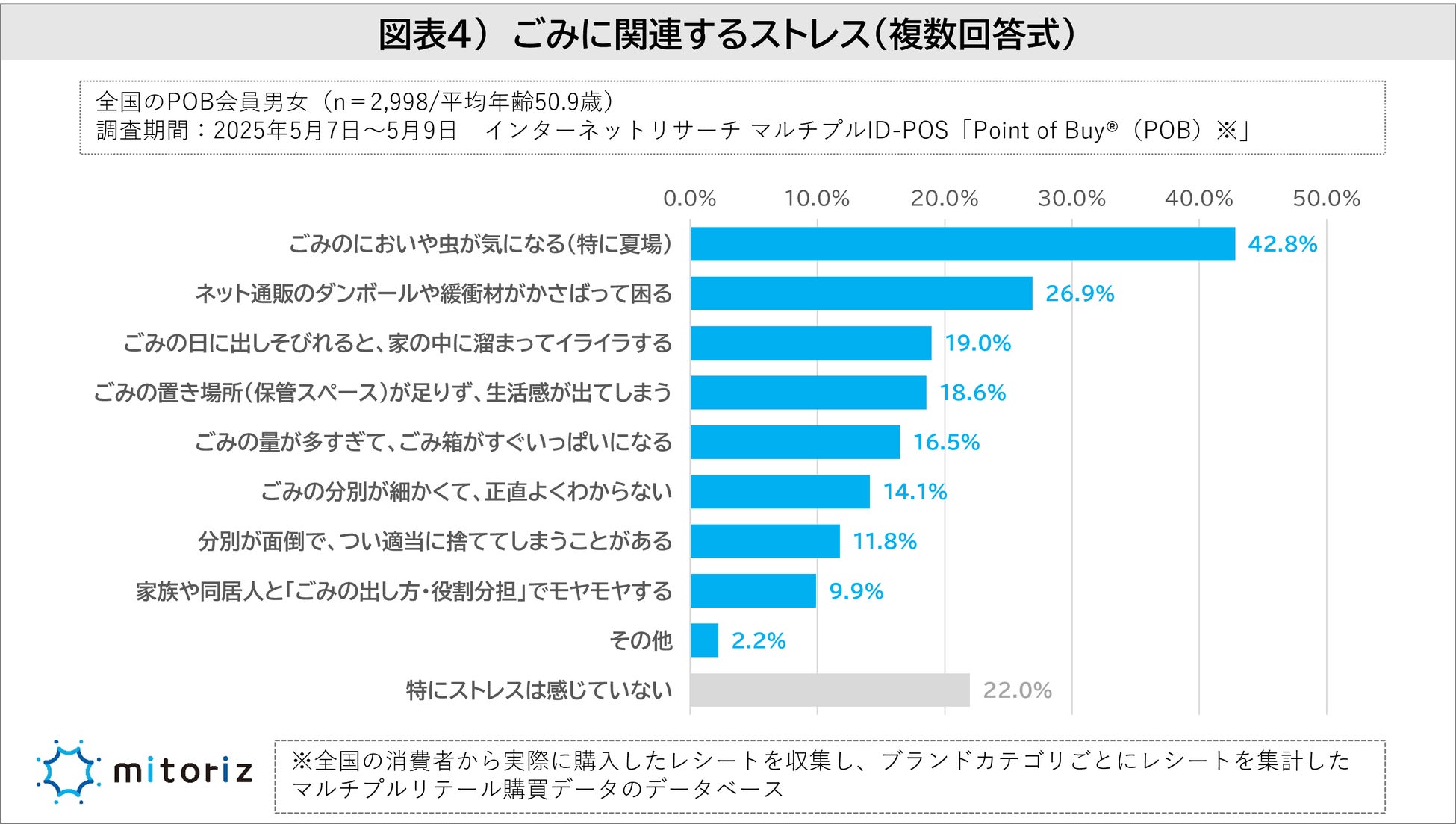 「ごみに関して感じるストレス」について調査したところ「ごみのにおいや虫が気になる(特に夏場)」が42.8%と最も多く、衛生面の不快感が大きなストレス要因となっていることがわかりました。次いで「ネット通販のダンボールや緩衝材がかさばって困る」が26.9%、「ごみの日に出しそびれると、家の中に溜まってイライラする」が19.0%で続き、家庭内のスペースやごみ出しのタイミングに関連したストレスが続いています。一方で「特にストレスは感じていない」と回答した人も22.0%存在しています(図表4)。