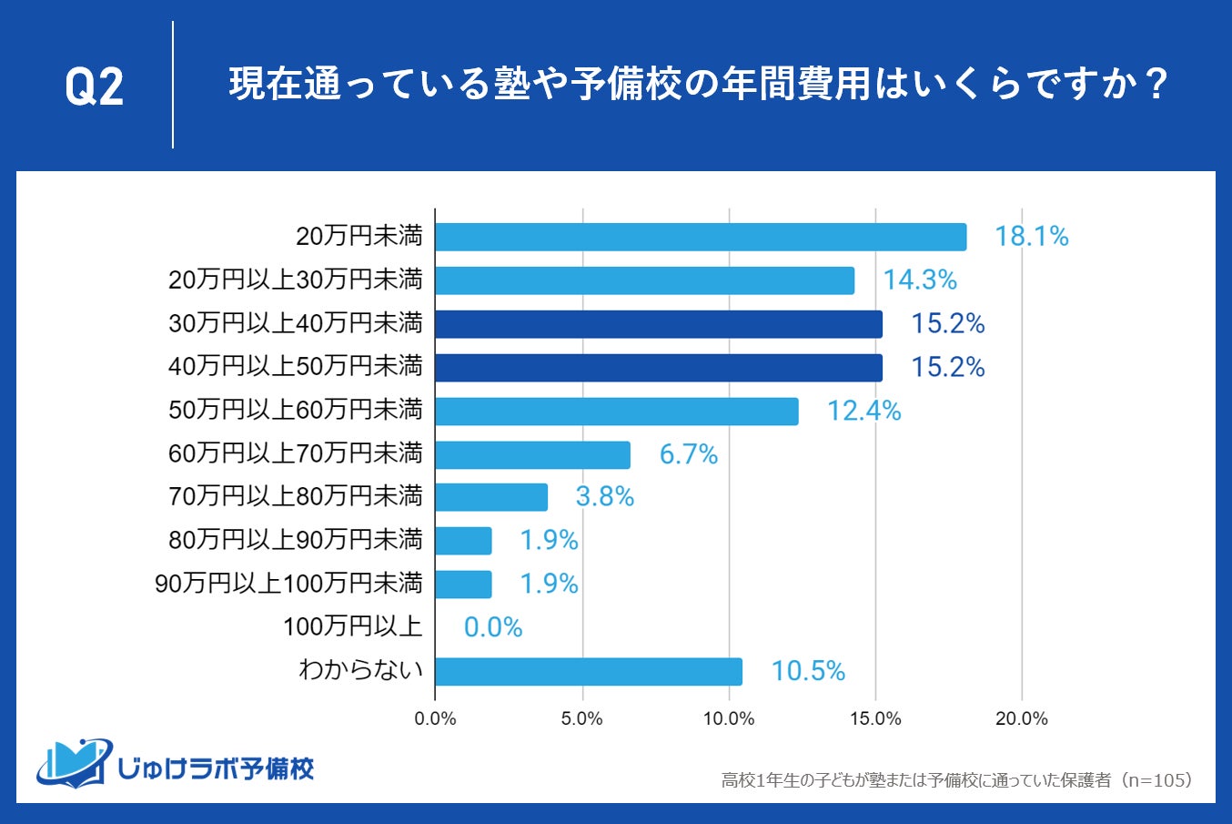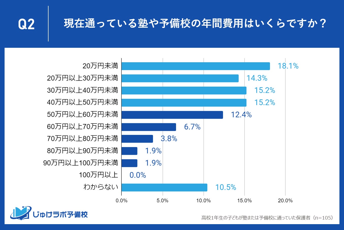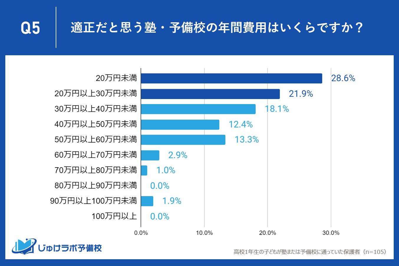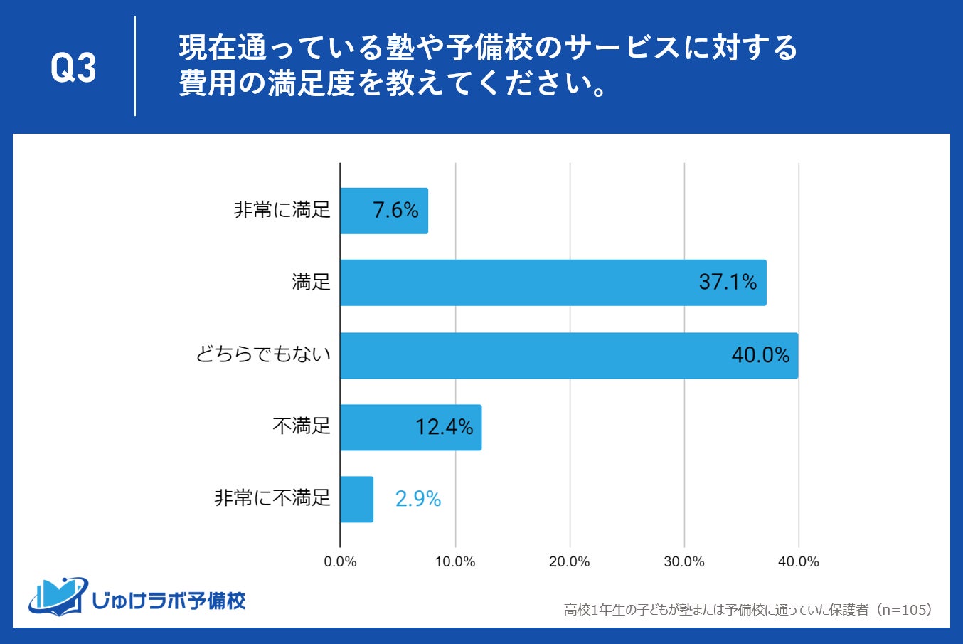 じゅけラボ予備校(所在地:大阪市北区、代表取締役:後藤智則)は、現在、塾または予備校を利用している高校1年生の保護者105名を対象に、塾や予備校の費用に関する教育費調査を実施しました。