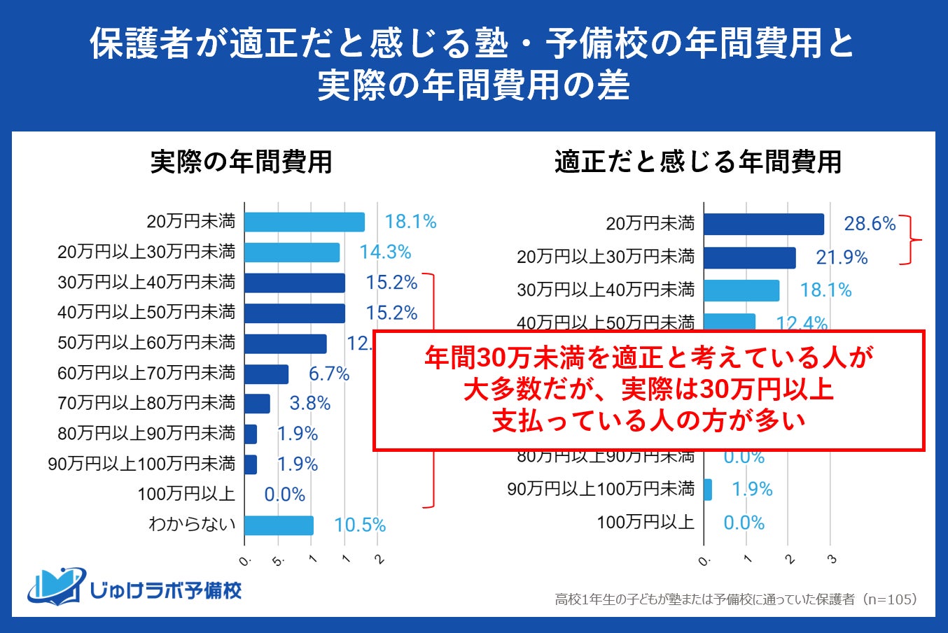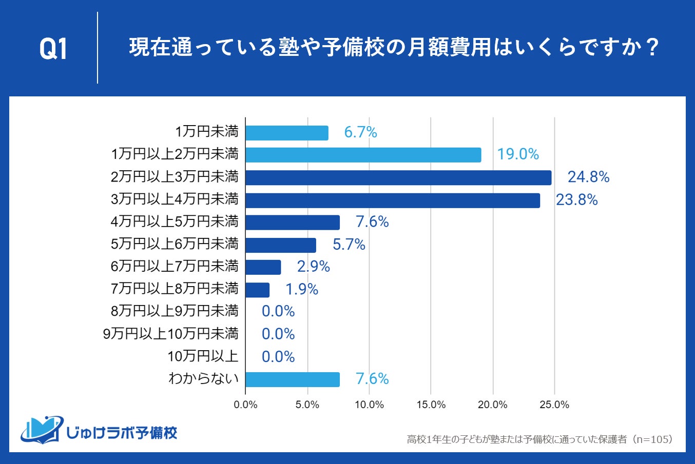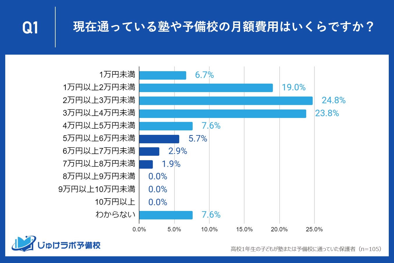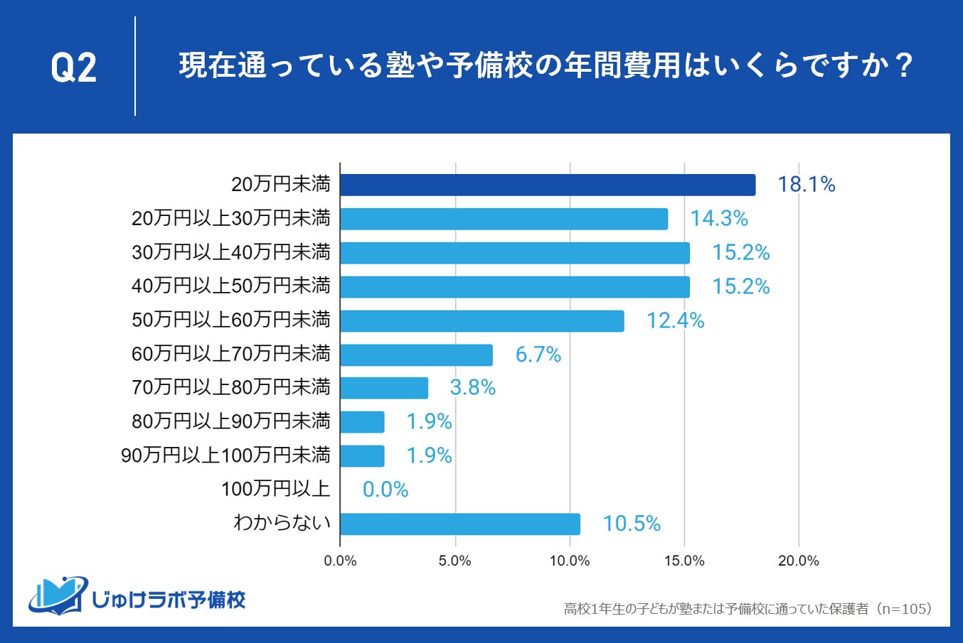 じゅけラボ予備校(所在地:大阪市北区、代表取締役:後藤智則)は、現在、塾または予備校を利用している高校1年生の保護者105名を対象に、塾や予備校の費用に関する教育費調査を実施しました。