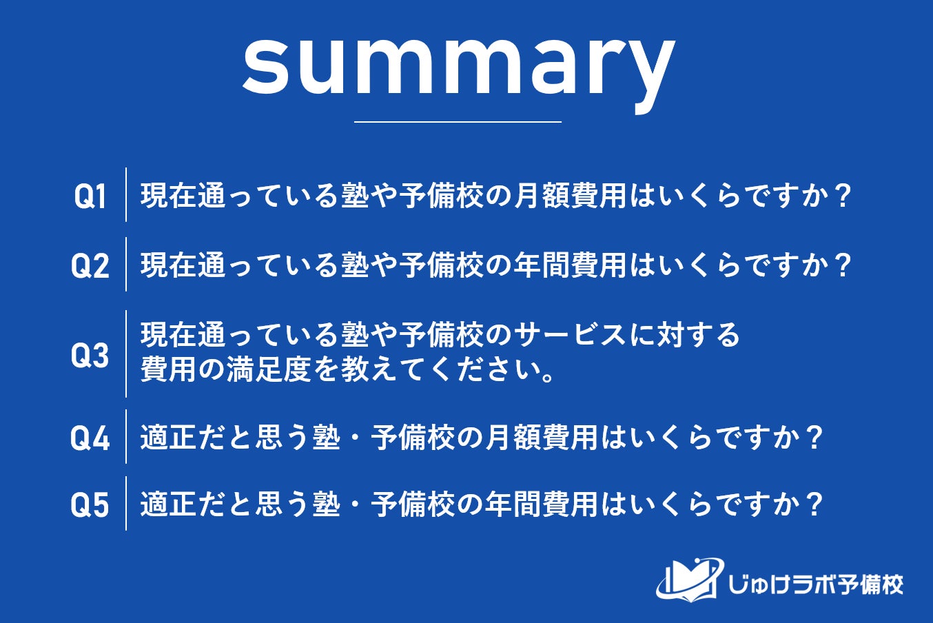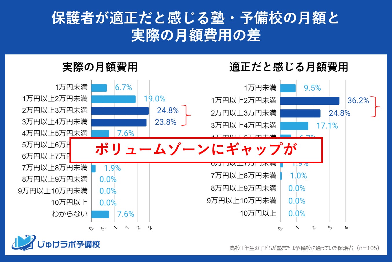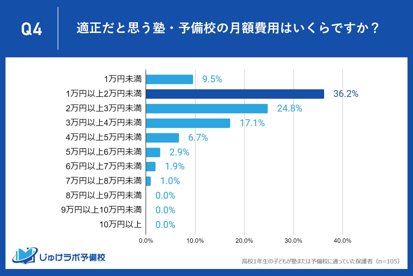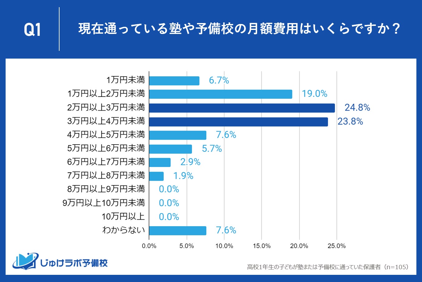 じゅけラボ予備校(所在地:大阪市北区、代表取締役:後藤智則)は、現在、塾または予備校を利用している高校1年生の保護者105名を対象に、塾や予備校の費用に関する教育費調査を実施しました。