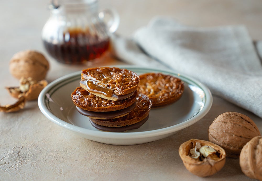 黒糖と生クリームでとろとろに炊き上げたキャラメルにカナダ産メープルシロップの上品な甘さとウォールナッツペーストの香ばしさを合わせました。メープルシロップの甘い余韻とウォールナッツペーストのコクと香ばしさが調和することで、クーベルチュールチョコレートとバターサブレとの一体感を創り出します。