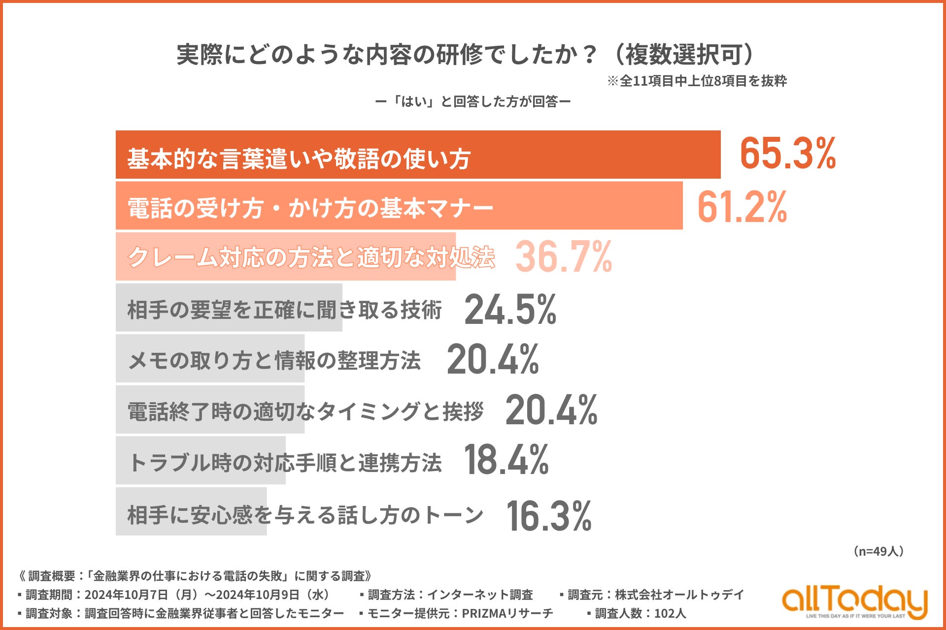 【オールトゥデイ|調査レポート】金融業界における電話対応の研修内容は『基本的な言葉遣いや敬語』『電話の受け方・かけ方の基本マナー』『クレーム対応の方法と適切な対処法』が上位に