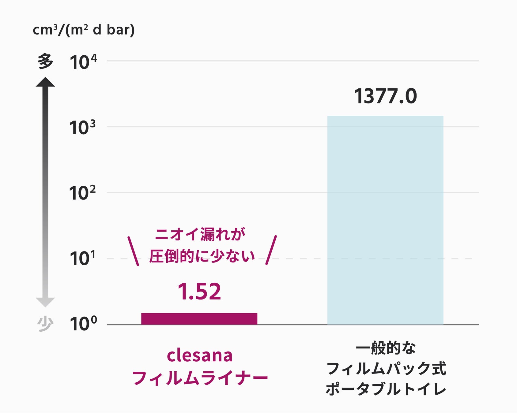 今回の分析で、クレサナ製の高バリアフィルムと一般的なポータブルトイレ用フィルムを比較試験した結果、一般的なポータブルトイレ用フィルムより約900倍、防臭性が高いことが実証されました。