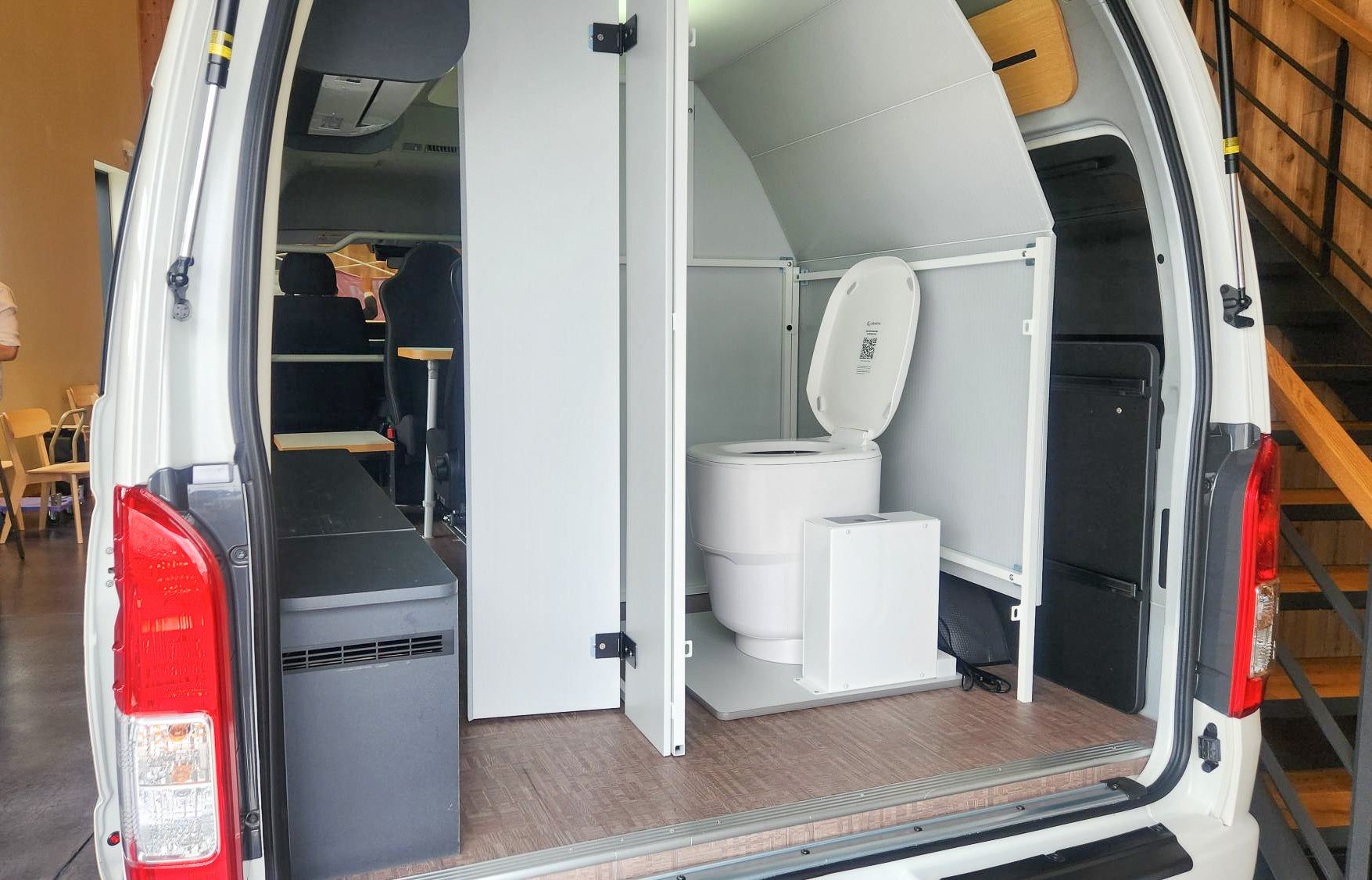 トヨタ/ハイエースをベースに、取り外し可能な脱着式シートや脱着式家具を車内に設置した車両で、レイアウトを用途に応じて組み替えられるモードチェンジが容易で、汎用性が高いのが特長です。平常時はコミューターバスとして使用し、屋外イベントの際は休憩・救護室として。また災害などの有事の際はトイレカーとしてなど、1台の車両を多方面&多目的に活用し平時活用できる、フェーズフリーな車両です。