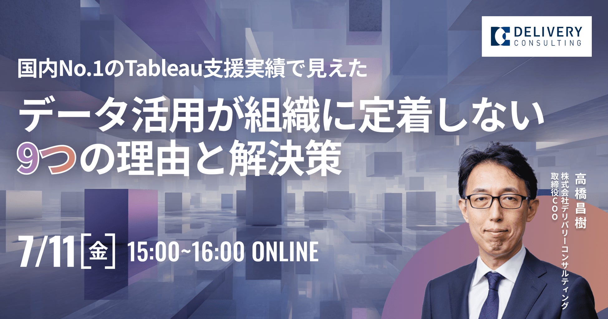 データリテラシーの向上を通じてデータドリブンカンパニーへの変革を支援する株式会社デリバリーコンサルティング(本社:東京都港区、取締役CEO:内藤 秀治郎)は、Tableau Japan(現:株式会社セールスフォース・ジャパン)設立時からのアライアンスパートナーとして多くの企業を支援してきたナレッジをもとに、データ活用を組織に定着させ、変化に強い組織をつくるための9つの観点について解説するWEBセミナーを開催いたします。