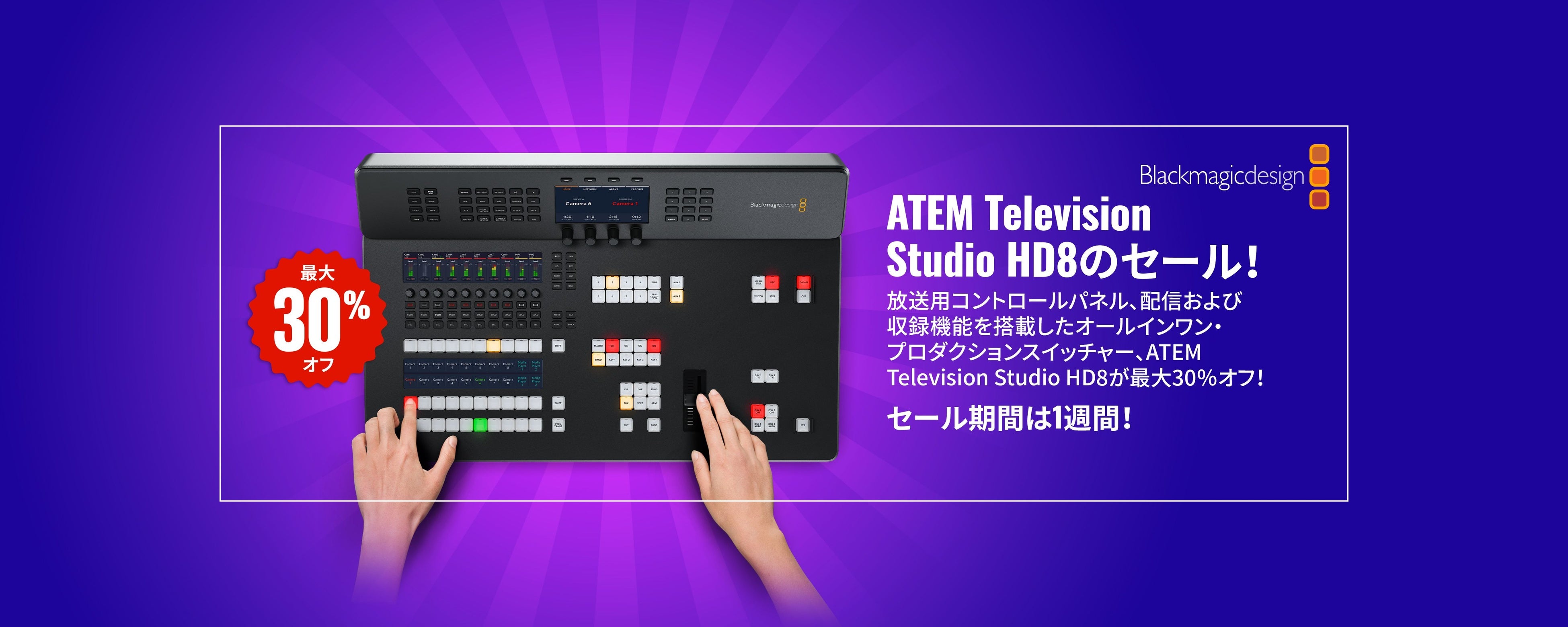 ATEM HD8シリーズは、カメラを接続するだけでスイッチングできるオールインワン·ソリューション。セールは期間限定です!
