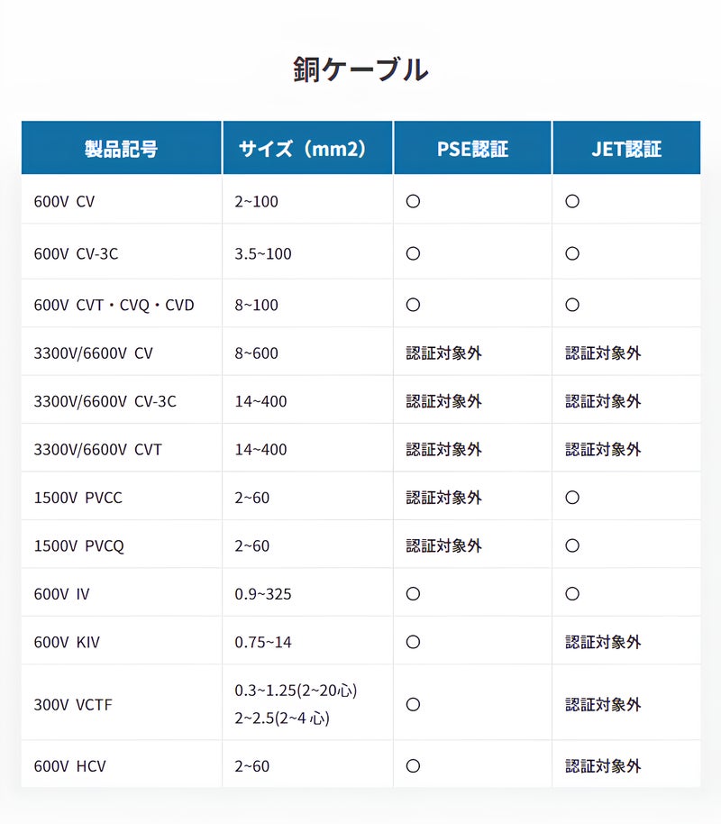 また、現在(2024年9月時点)600V CVT・CVD・CVQケーブル(8~100SQ)のJET認証も取得しました。日本市場向けの銅ケーブルのラインナップと認証取得状況は以下となります。