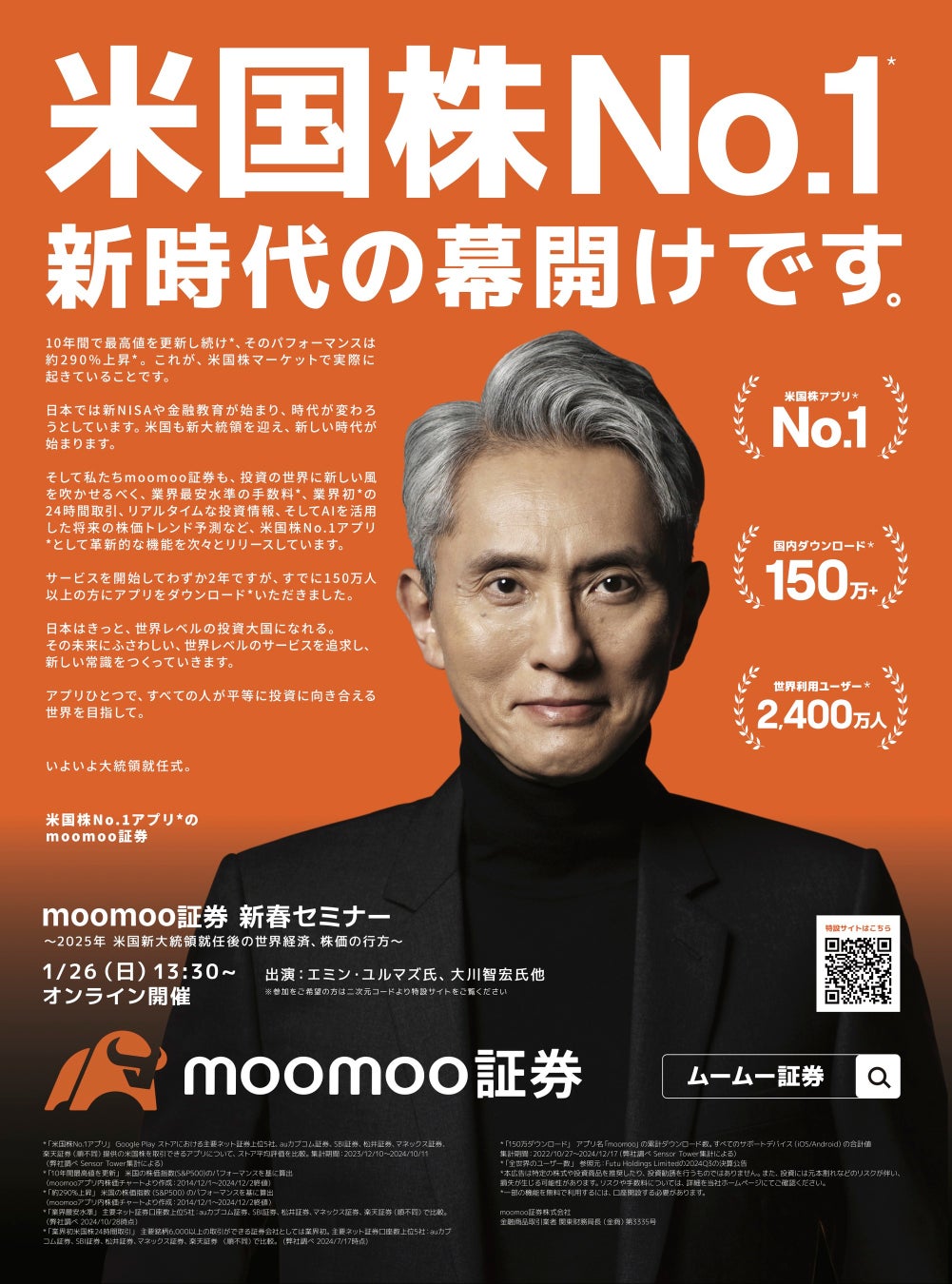 20日掲載の広告では、ブランドアンバサダーを務める松重豊氏とmoomooブランドカラーのオレンジを背景に、「米国株No.1新時代の幕開けです」のスローガンを大きく表現しました。
