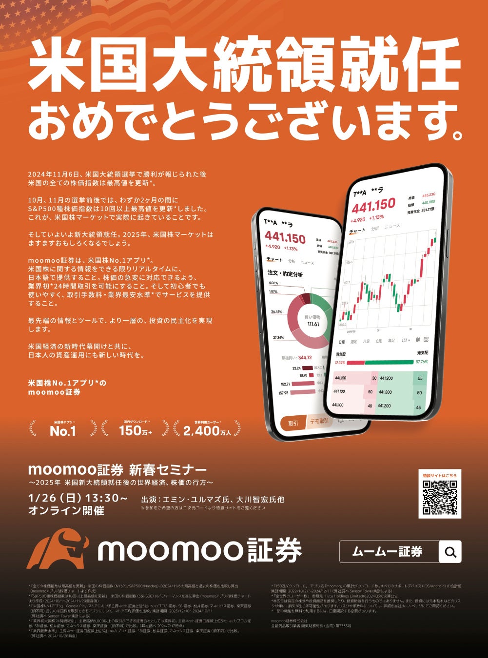 翌日の21日掲載の広告では、昨年米国市況が盛り上がったこと(※3)や、2025年に新大統領就任で米国株マーケットがますます面白くなると期待されていること、そしてその中で私たちmoomoo証券も、投資の世界に新しい風を吹かせるべく、米国株No.1アプリとして革新的な機能を次々とリリースしていることが伝えられています。