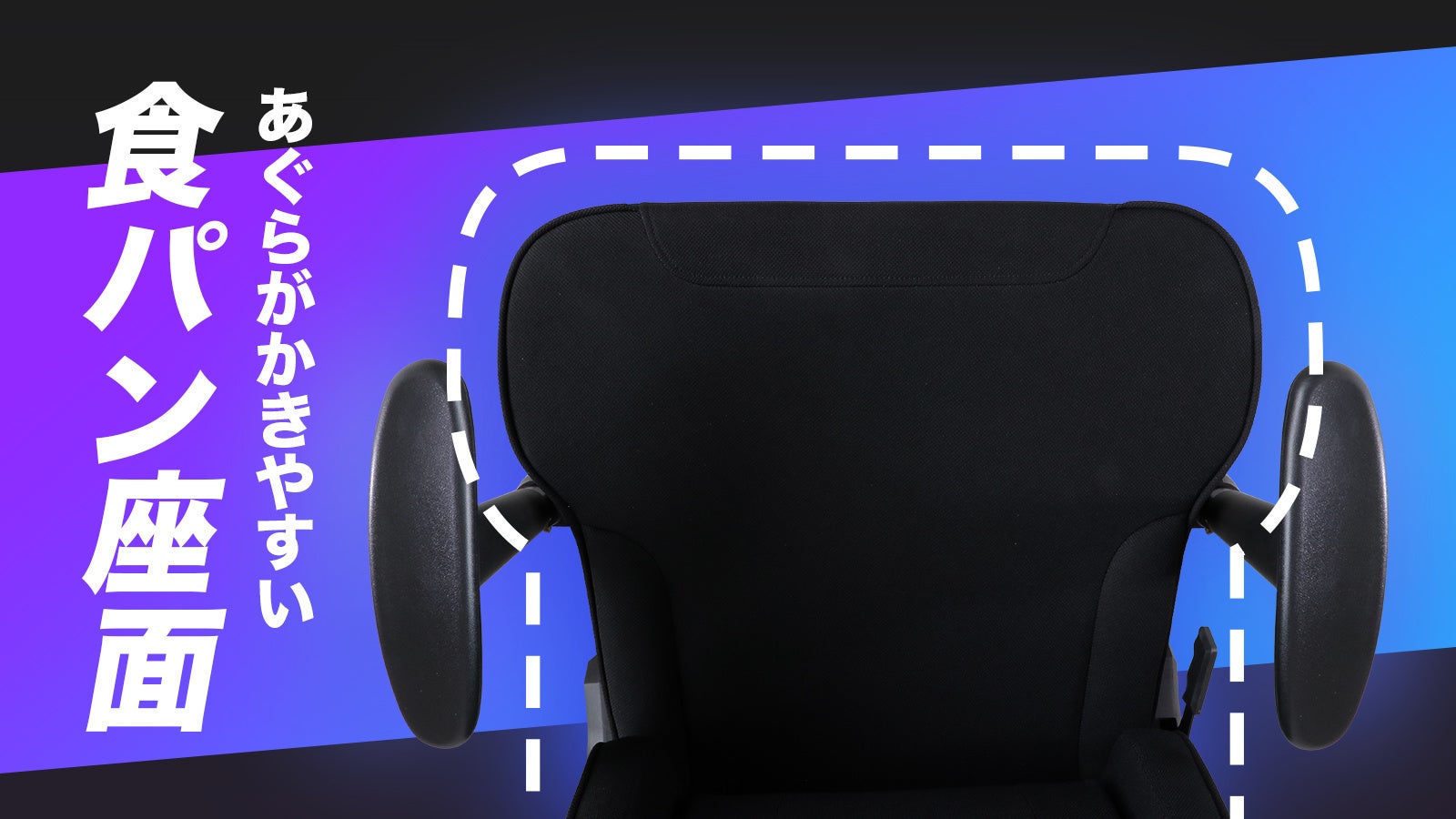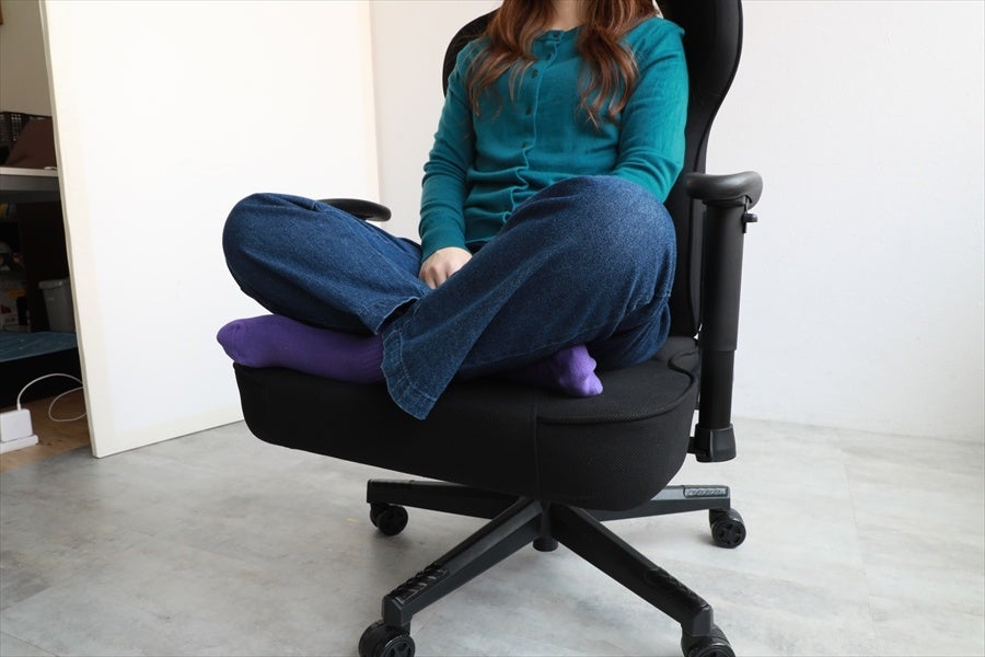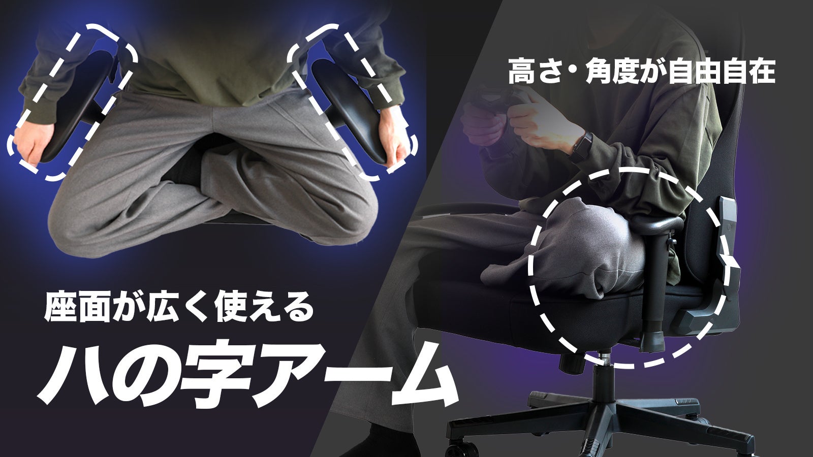 一般的なゲーミングチェアと異なり、足を組んでもアームレストに触れず、ソファのような広々とした座り心地を提供します。