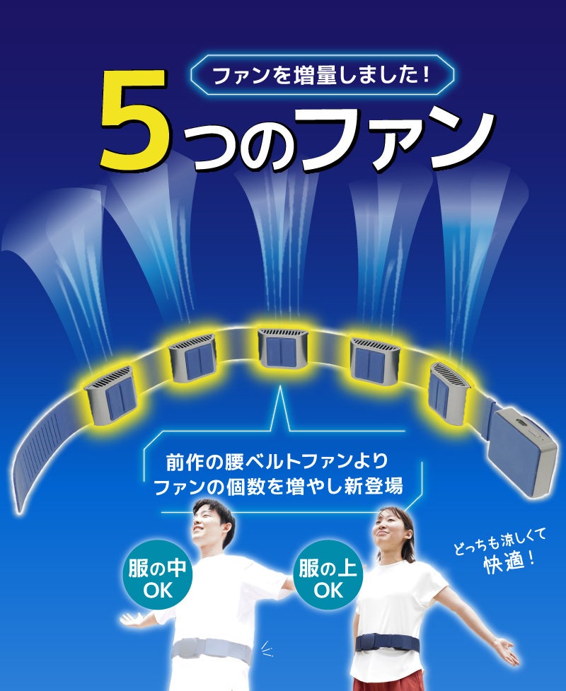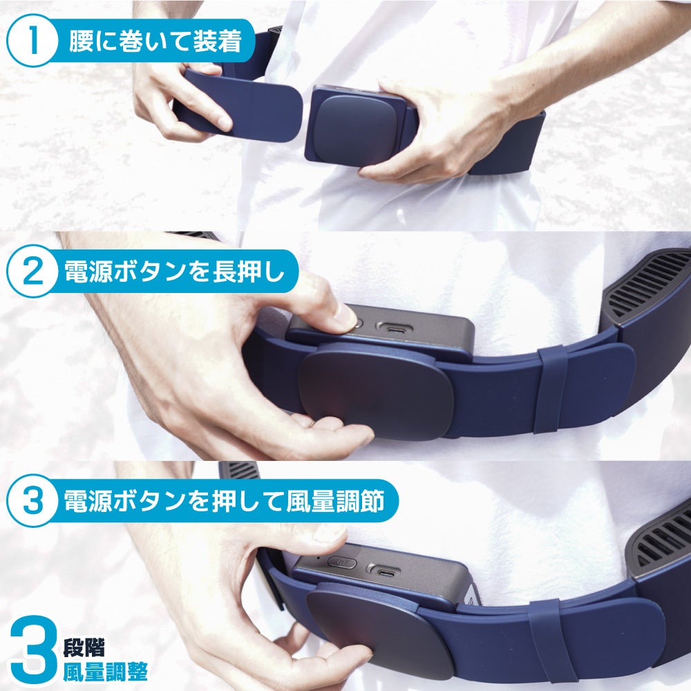 変身ベルトのように腰に巻いて5か所の扇風機から風を全身浴びられるウェアブルファン