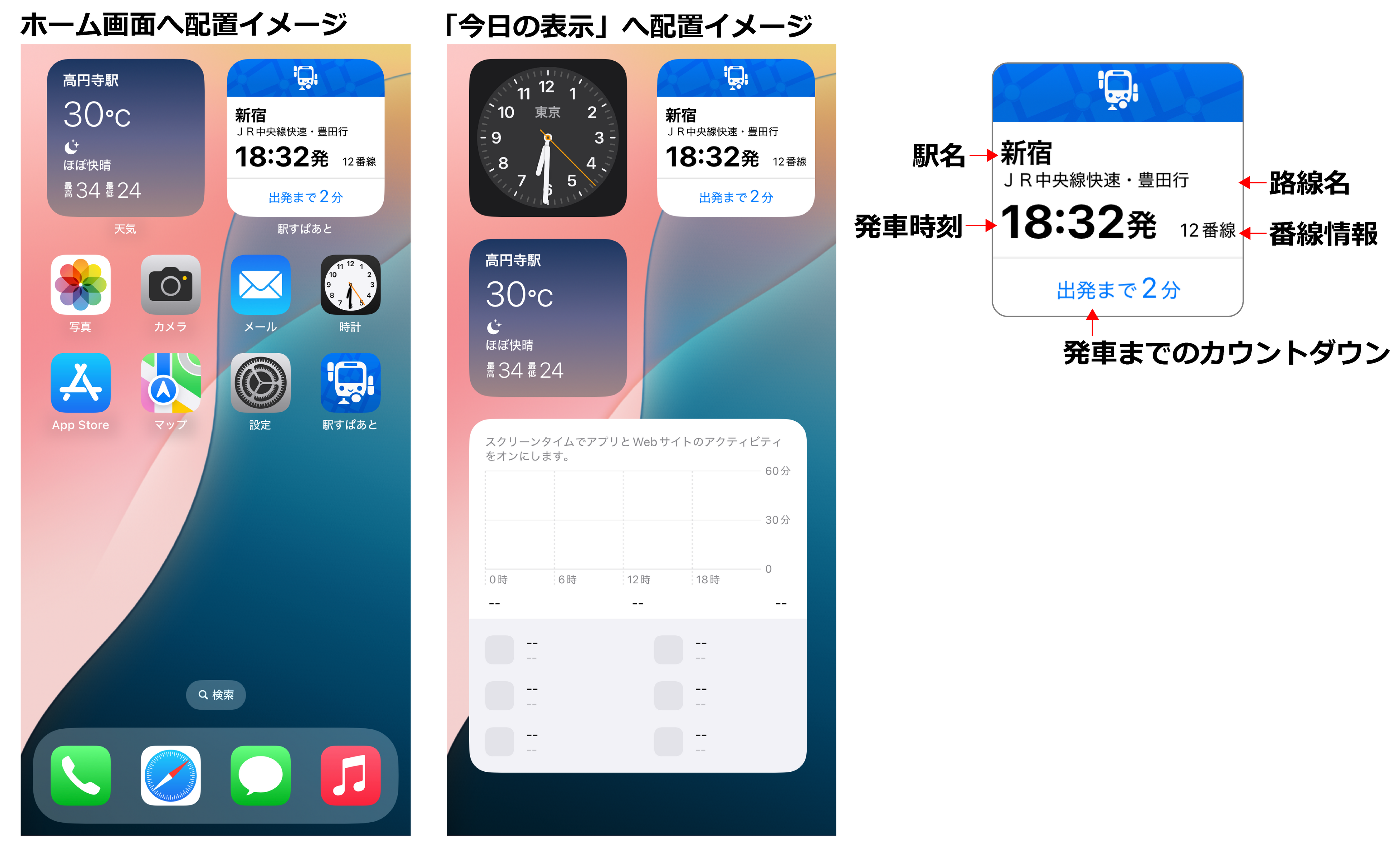 iOS 18からホーム画面の任意の空きスペースにアプリやウィジェットを配置できるようになったことを受け、ロック画面で提供し好評をいただいていた「次の乗り換え」機能を、ホーム画面と「今日の表示」にも対応しました。アプリを開くことなくホーム画面にて、次の乗り換えに必要な情報を確認できます。