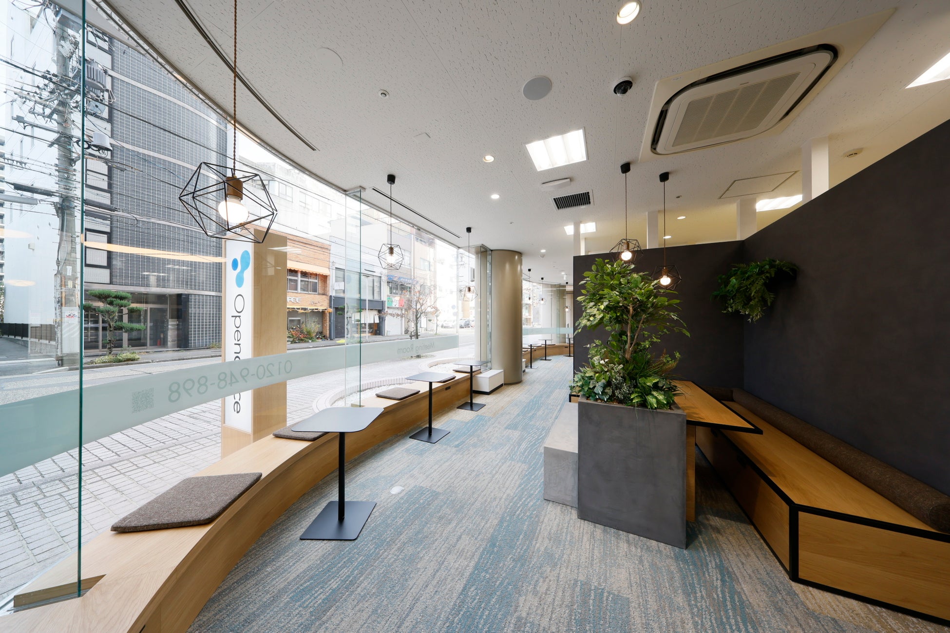 ラウンジの床には水面をイメージしたタイルカーペットを採用し、“慈しみの水”を表現。設置された突板製のベンチやテーブルは、本物の木の質感を活かした造りによって、自然をより身近に感じられます。また、ペンダントライトの高さをそれぞれ変えることで空間にリズムが生まれ、賑やかで親しみやすい雰囲気を演出。さらに、モルタルや植栽を配置することで國六様のロゴのコンセプトの樹木、太陽、水、大地といった自然の揺らぎを感じられる空間となっています。