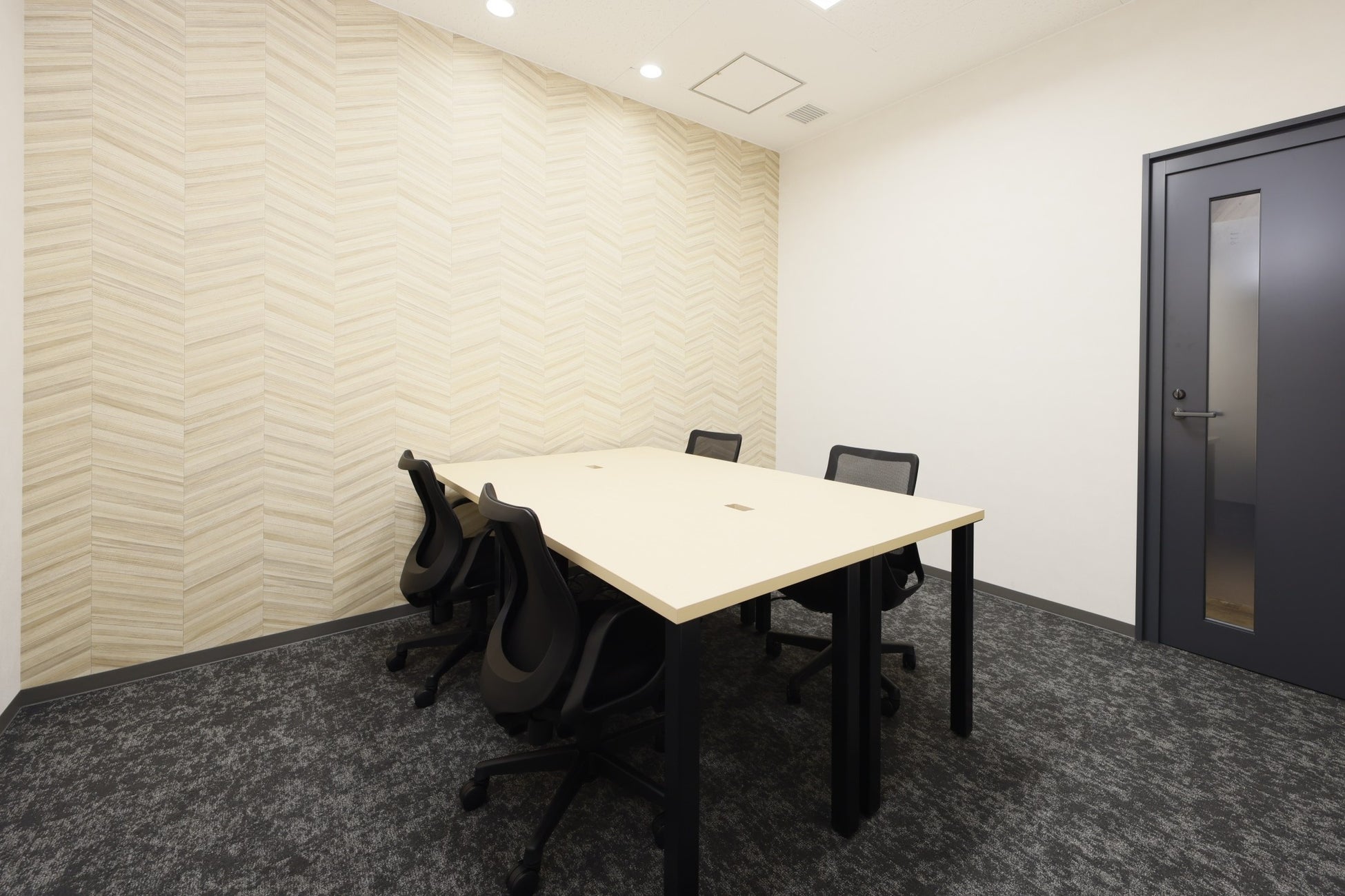 オフィススペースの壁面には、オープンオフィスのロゴカラーをモチーフにした青や、アクセントクロスにした緑や黄色が配され、オープンオフィスの明るく開放的な印象を演出し、入居者の方には好みに合った部屋の雰囲気を選んでいただけるようになっています。また、廊下、ミーティングルーム、コワーキングスペースの壁面には木目調のクロスを使用し、エントランスから続く“自然の流れ”が空間に統一感を与えています。