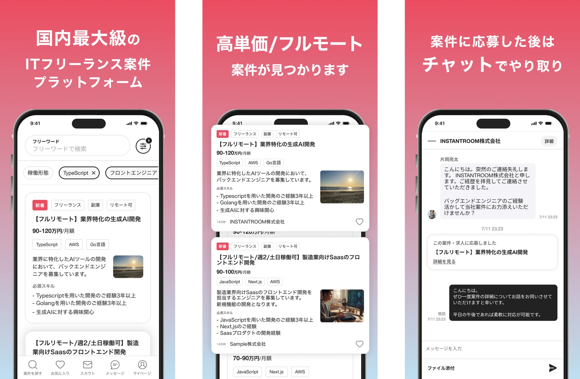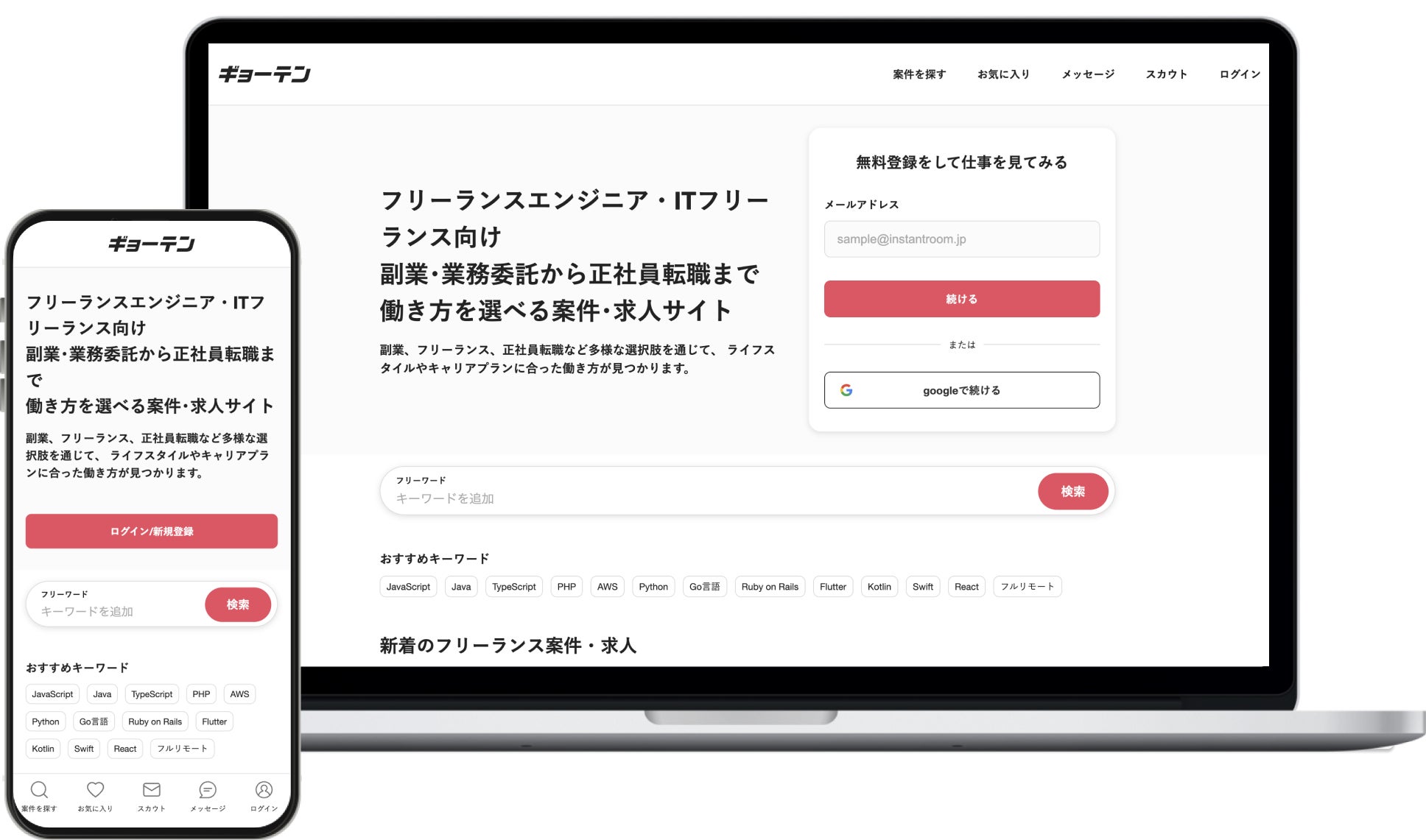INSTANTROOM株式会社(本社:東京都渋谷区、代表取締役:曽根弘介)は、フリーランスエンジニア・ITフリーランス向けの副業・業務委託から正社員転職まで働き方を選べる案件・求人サイト「ギョーテン」(https://gyou-ten.com/)のiOS版およびAndroid版アプリを本日リリースしたことをお知らせいたします。