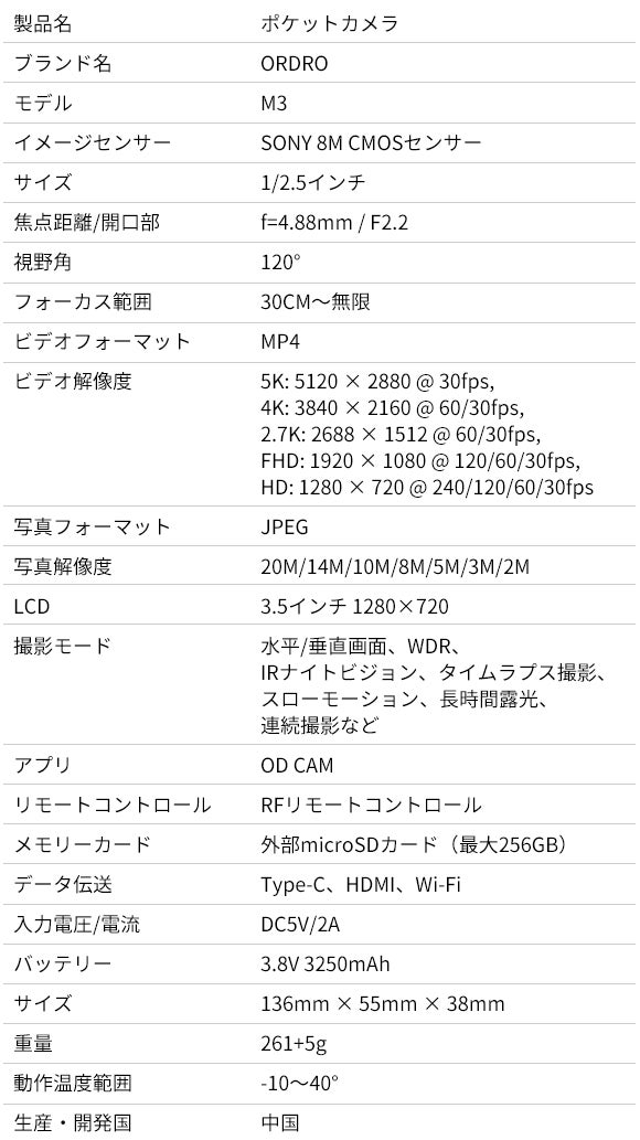 「Ordro M3」は、次世代のポケットカメラで、以下の特徴があります: