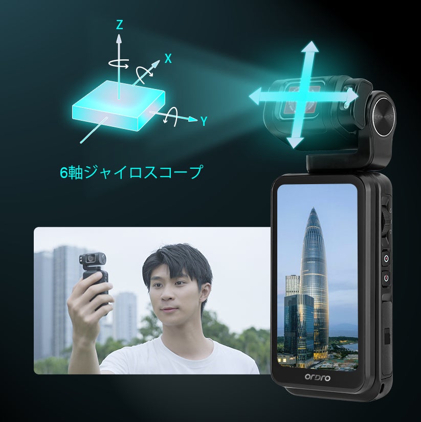 内蔵された6軸ジャイロスコープは、カメラの微細な動きを検出し、手振れによるブレを効果的に補正します。歩きながらの撮影や不安定な場所での撮影でも、ブレずに滑らかな映像を得ることができます。