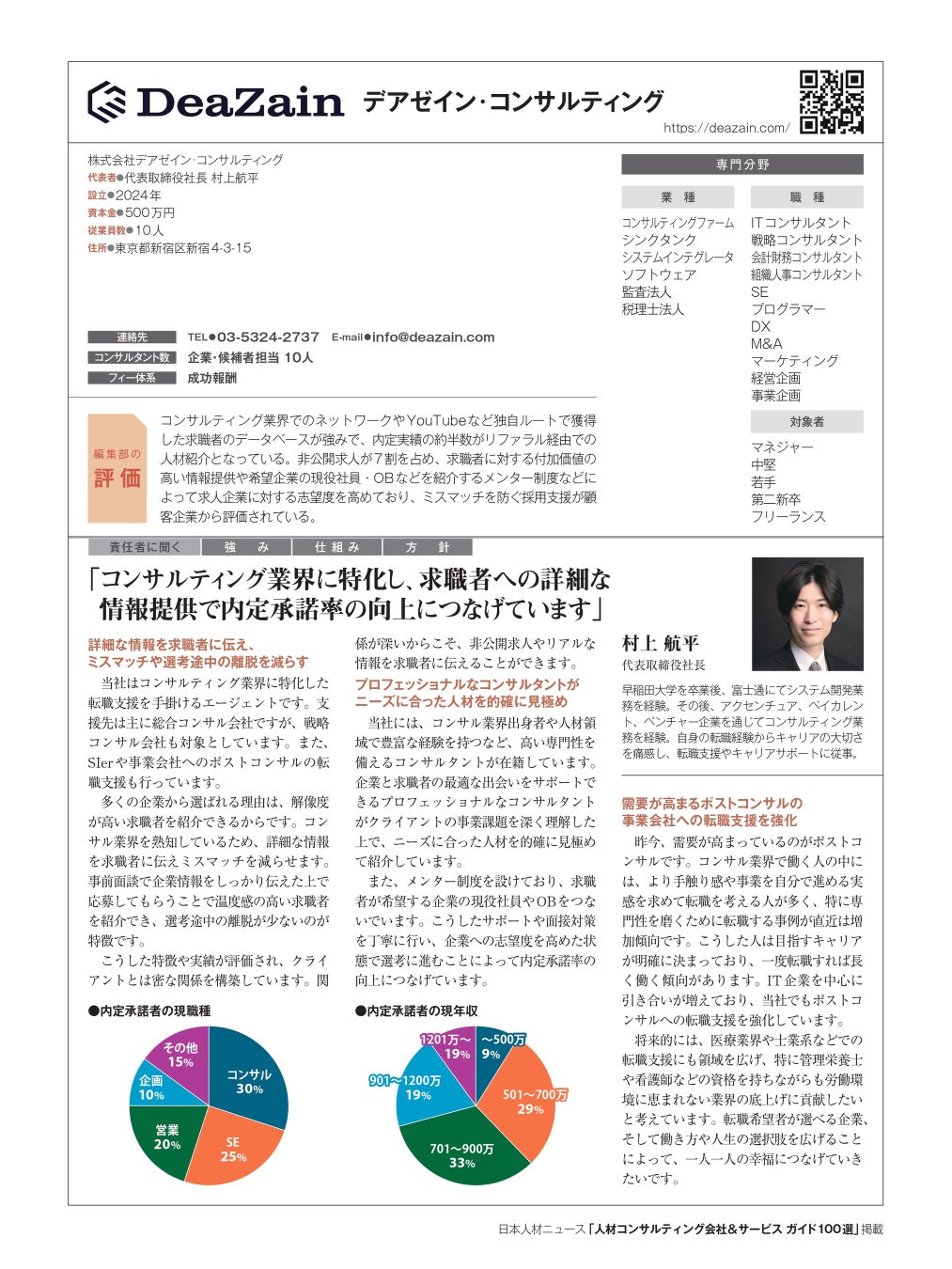 人事専門誌「日本人材ニュース」を発行する株式会社日本人材ニュース社(東京都千代田区、代表取締役:吉越利成)は、企業の人材採用を支援できる優れたコンサルティング会社とサービスを紹介する「人材コンサルティング会社&サービスガイド100選」に、デアゼイン・コンサルティング(東京都新宿区、村上航平代表取締役社長)が参画したことをお知らせいたします。