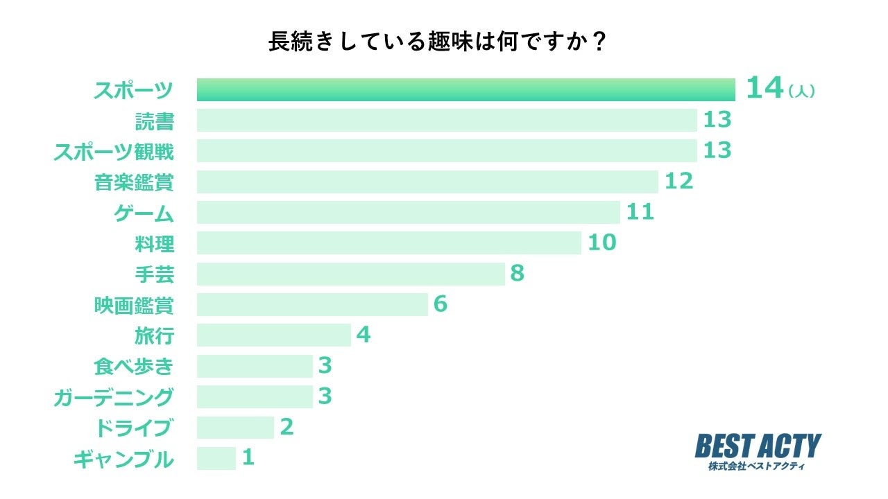長続きしている趣味について100人にアンケートを行ったところ、「スポーツ」と回答する人が最も多い結果となりました。