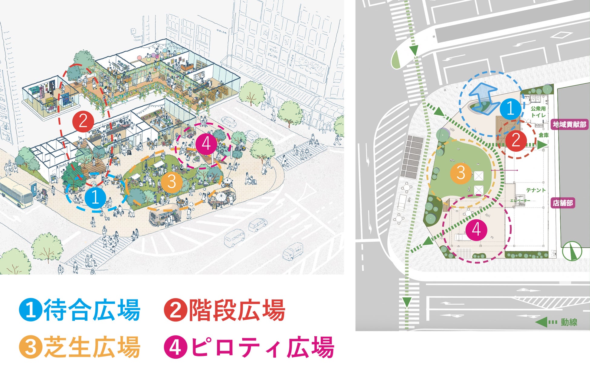 さらに、計画地内には特徴の異なる4つの広場を設けることで、様々なアクティビティが展開できるよう工夫しています。
