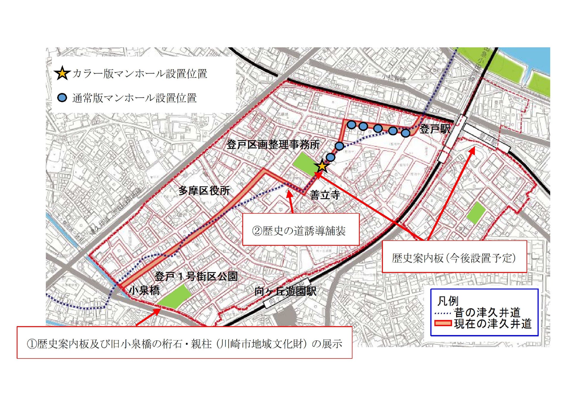 この取組は、登戸で親しまれてきた歴史資源を未来に継承し、地域への愛着を醸成する取組の1つとして、沿道のマンホールを津久井道の歴史が感じられるデザインに更新するもので、今後、歴史文化を伝える取組に活用していきます。