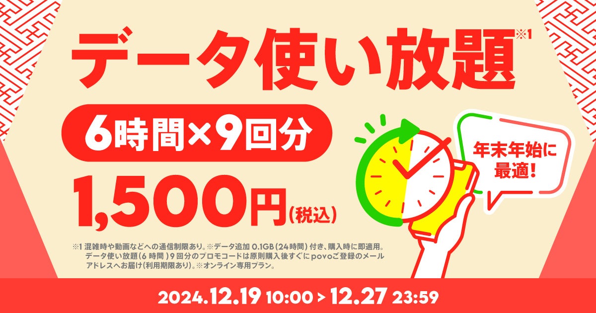 クリスマスから年末年始にかけての連休期間、家族や友人とのお出かけをしても安心なデータ使い放題トッピングを提供します。最大9連休になる方も多いことから、6時間データ使い放題(250円相当)(注2)を、9回分がセットでおトクに利用できます。