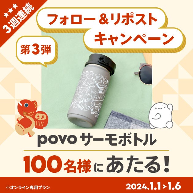 3週連続で、木曜日(12月19日/12月26日/1月1日)から翌週水曜日まで、povoのオリジナルグッズが抽選で合計160名にあたるXリポストキャンペーンを実施します。povo公式Xアカウント(@povo_official)をフォローのうえ、対象の投稿をリポストいただいたお客さまが対象です。