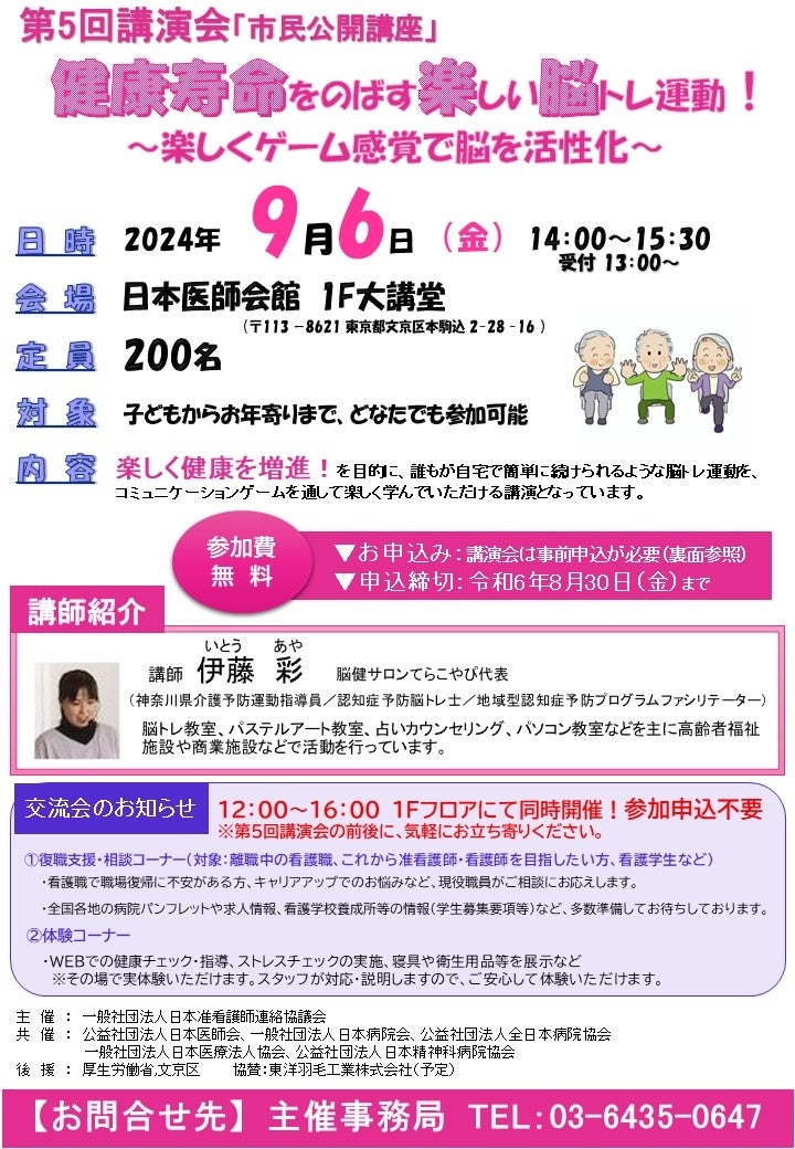 日本医師会はこの月間の企画として、9月6日(金)に市民公開講座「健康寿命をのばす楽しい脳トレ運動」を日本准看護師連絡協議会(この講座の主催団体)と共催により開催することになりました。