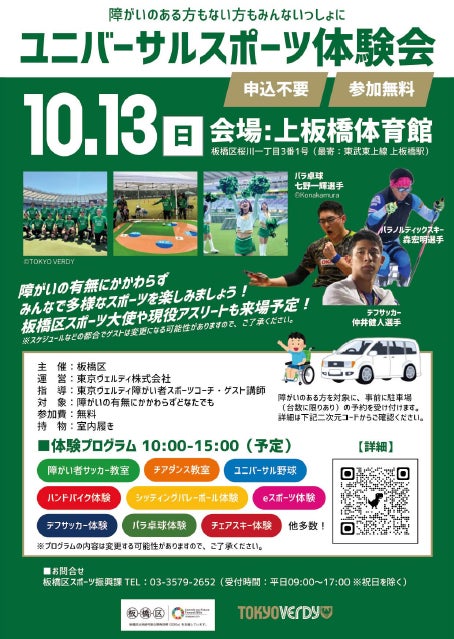 板橋区では、障がいの有無や年齢を問わず、誰でも参加し、活動できるスポーツの総称「ユニバーサルスポーツ」を推進しており、ユニバーサルスポーツに特化した大規模なスポーツイベントは板橋区として初の開催となります。体験会では、ユニバーサル野球、デフサッカー、シッティングバレーボール等のユニバーサルスポーツに種目を特化した、約15種類の様々なスポーツを体験できます。パラリンピアンを中心とした板橋区スポーツ大使や現役アスリートが複数参加する予定となっており、実際に選手から話を聞きながら、一緒に競技体験をすることもできます。