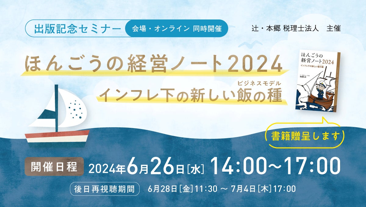 辻・本郷 税理士法人(本社:東京都新宿区、理事長:徳田孝司)は、 2024年6月26日(水)に「ほんごうの経営ノート2024 出版記念セミナー~インフレ下の新しい飯の種(ビジネスモデル)~」をオンラインと会場で同時開催いたします。 低金利下のインフレをどう乗り切るか? 失敗も数多くしてきた本郷が、これからのインフレを乗り切るための理屈と実践を語ります。※後日再配信あり。