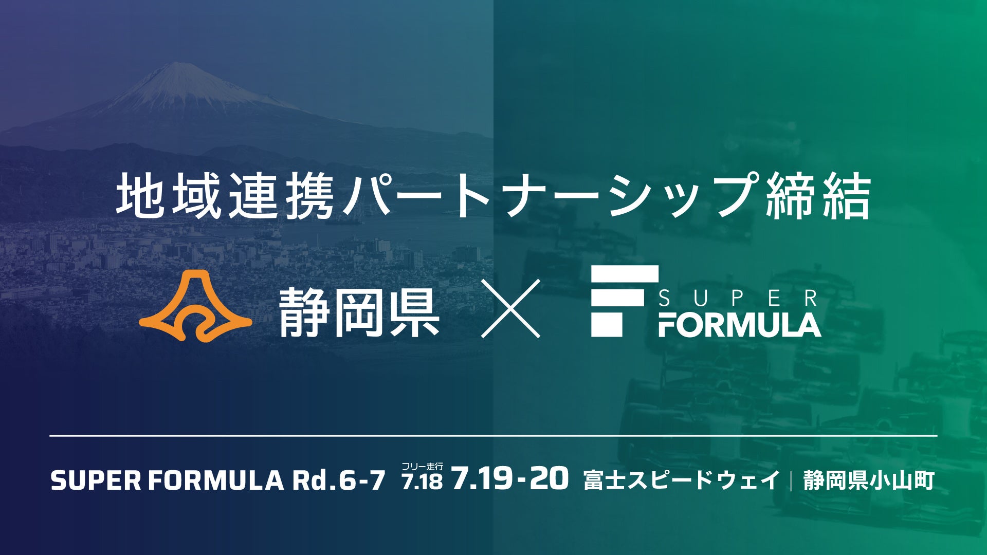 国内最⾼峰で最速のフォーミュラカーレースシリーズである全⽇本スーパーフォーミュラ選⼿権(以下「SUPER FORMULA」)を開催する株式会社⽇本レースプロモーション(代表取締役社⻑:上野禎久、以下「JRP」)は、7⽉に第6戦・第7戦、10⽉に第9戦・第10戦が開催される富⼠スピードウェイがある静岡県(知事:鈴⽊康友)と、モータースポーツ振興と地域活性化を⽬的に「地域連携パートナーシップ」を締結いたしました。