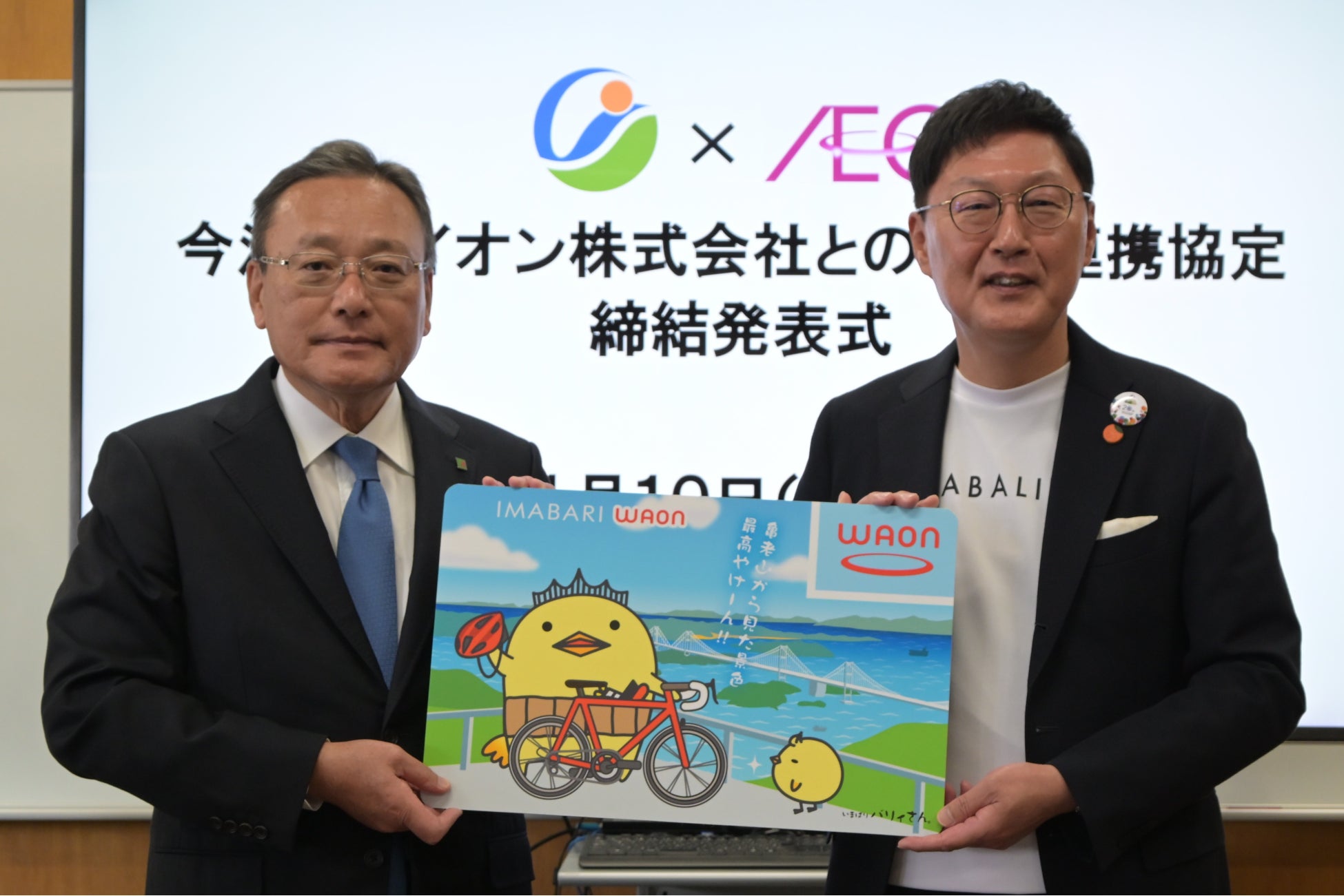 イオン株式会社(本社:千葉県千葉市、代表執行役社長:吉田昭夫、以下「イオン」)と愛媛県今治市(市長:徳永繁樹)は、2025年11月10日(月)に包括連携協定を締結しました。この協定は、今治市における地域の一層の活性化と市民サービスの向上を目的に、相互の連携をより強化するために締結されたものです。同日には、協定の取り組みの一環として、ご当地WAON「IMABARI WAON」が発行され、利用金額の一部が「今治市の子どもたちを応援する」事業に寄付されることが発表されました。