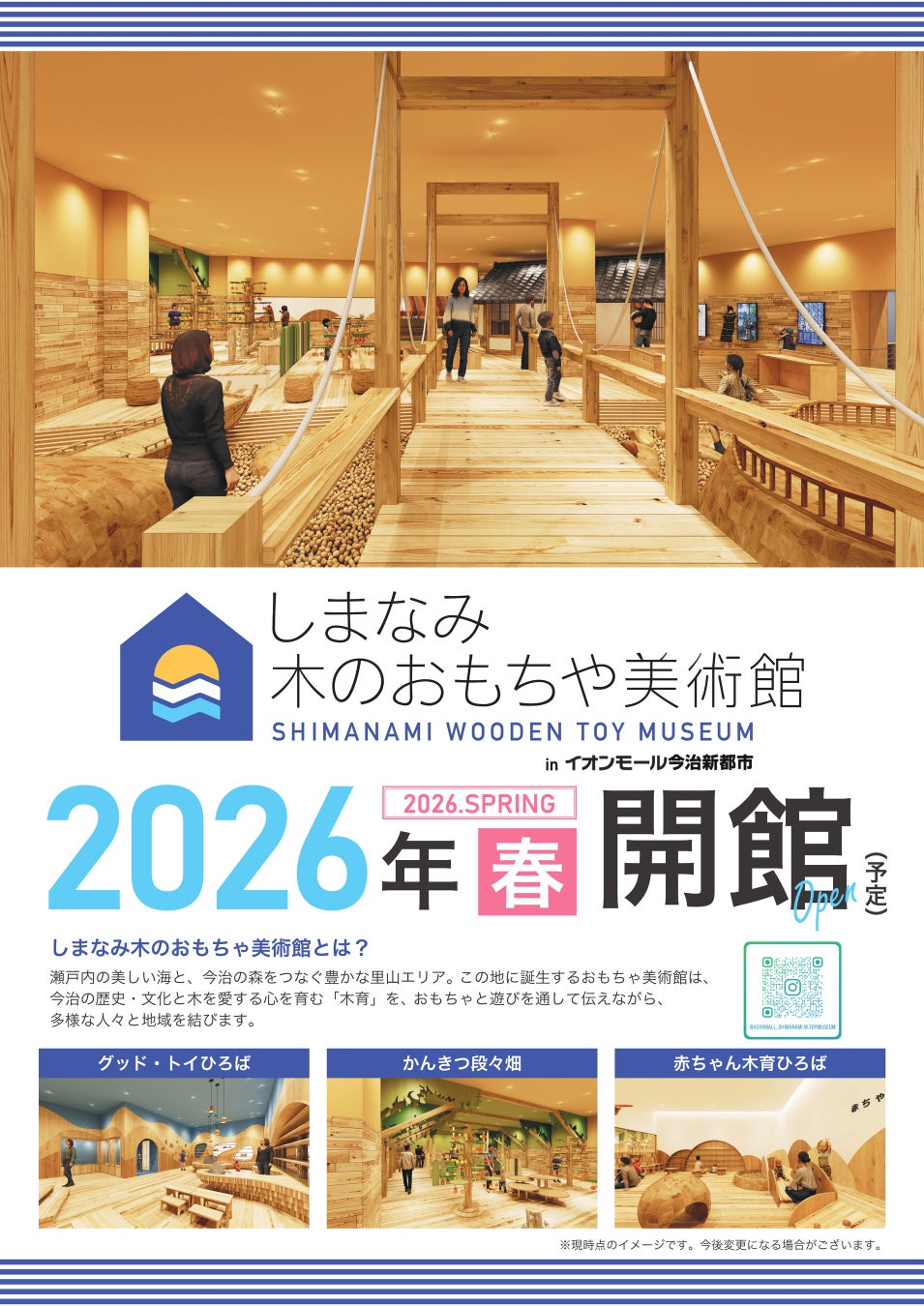 今治市は、2024年6月1日に東京おもちゃ美術館(特定非営利法人芸術と遊び創造協会)とイオンモール株式会社の三者で「しまなみ木のおもちゃ美術館設立・運営に向けた連携協定」を締結し、設立に向けて相互に協力をしてきました。「しまなみ木のおもちゃ美術館」は、イオンモール今治新都市が設置主体となり、FC今治の運営会社である株式会社今治.夢スポーツの運営により、2026年春に開館予定です。