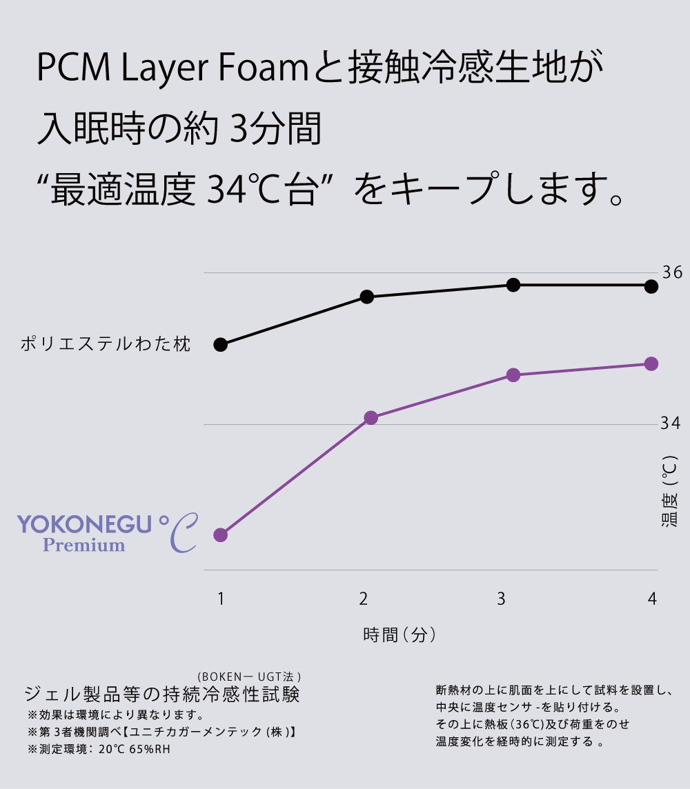 今回、そのPCMをYOKONEGU Premium ℃の上層部ウレタン(PCM Layer Form)に適量配合し、付属の接触冷感素材の専用カバーと組み合わせる事で、入眠時の最適温度と言われる34℃台を約3分間キープする事に成功致しました。