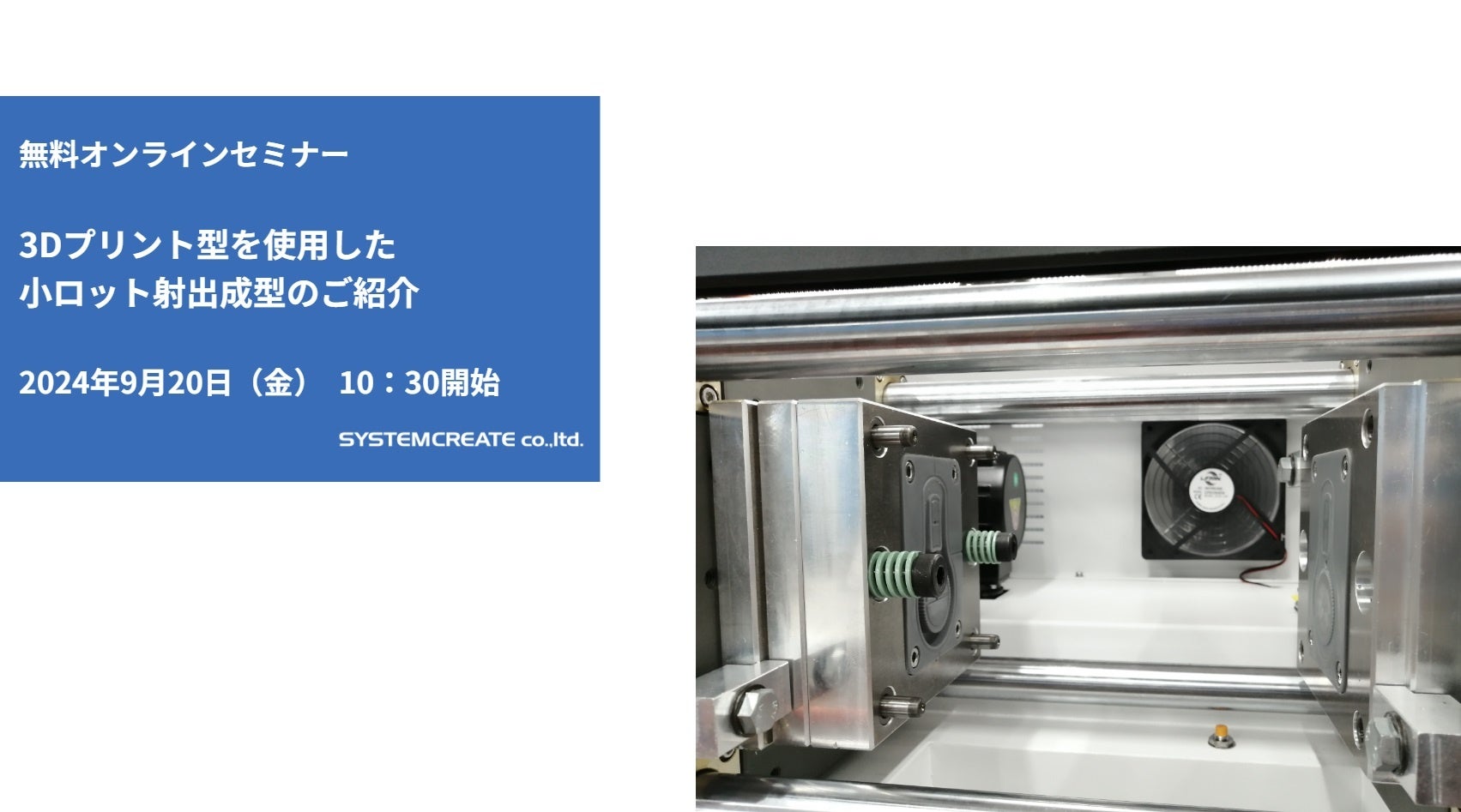 株式会社システムクリエイト(本社:大阪府東大阪市荒本新町、代表:川上正義)は、2024年9月20日(金)10:30に、無料オンラインセミナー「3Dプリント型を使用した小ロット射出成型のご紹介」を開催いたします。
