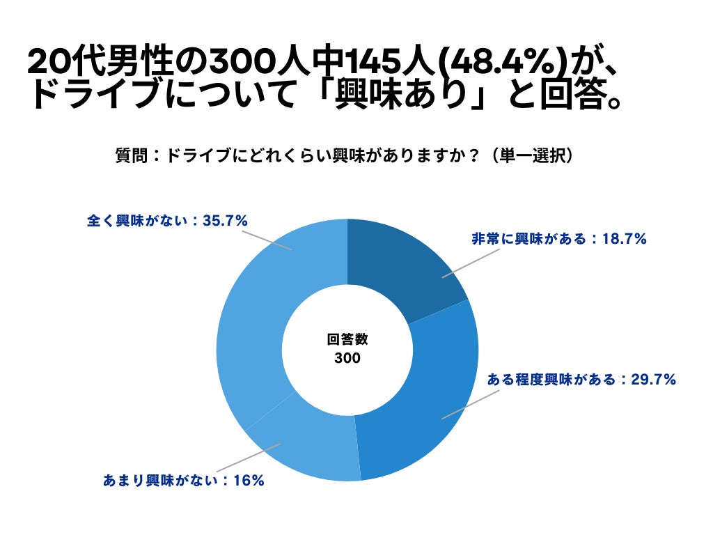 20代男性の300人中145人(48.4%)が、ドライブについて「興味あり」と回答【ドライブに関するアンケート】