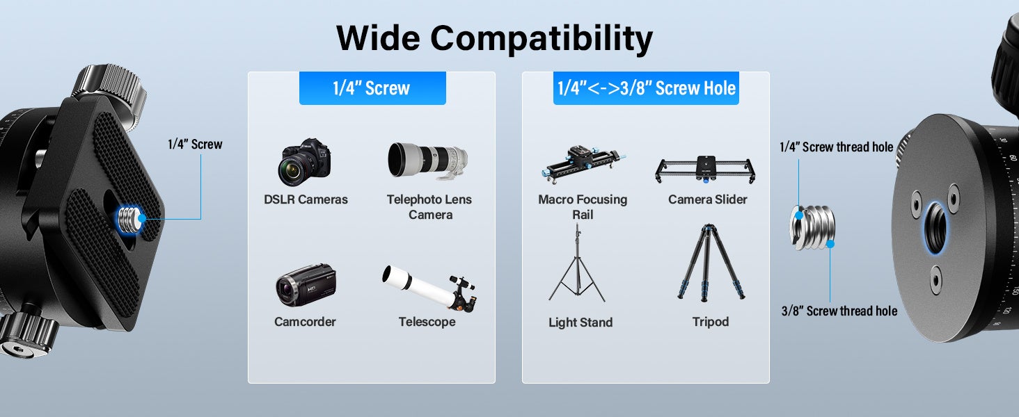 1/4インチネジと3/8インチメスネジを備えたクイックリリースプレートで、ほとんどのDSLRカメラ、ビデオカメラ、双眼鏡、カメラスライダーなど、あらゆる機器に対応。どんな撮影機材でも瞬時に取り付け可能で、あなたの撮影環境に完璧にフィットします。