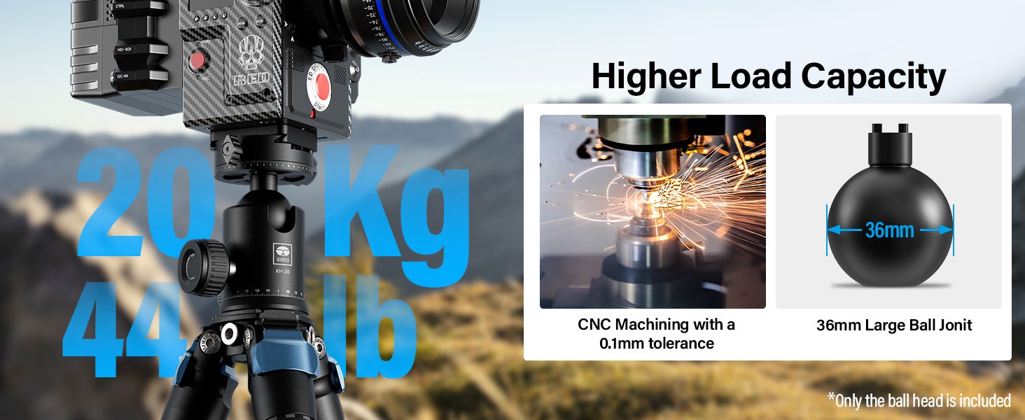 高強度アルミ製ボールヘッド、直径36mmの大型メタルボール搭載で、驚異的な耐荷重を実現。50mmのワイドベースが三脚との接触面積を拡大し、圧倒的な安定感を提供。DSLR、ミラーレスカメラ、ビデオカメラをはじめ、最大44ポンド(20kg)までの機器をしっかりサポート。どんな環境でも確実なパフォーマンスを発揮します。