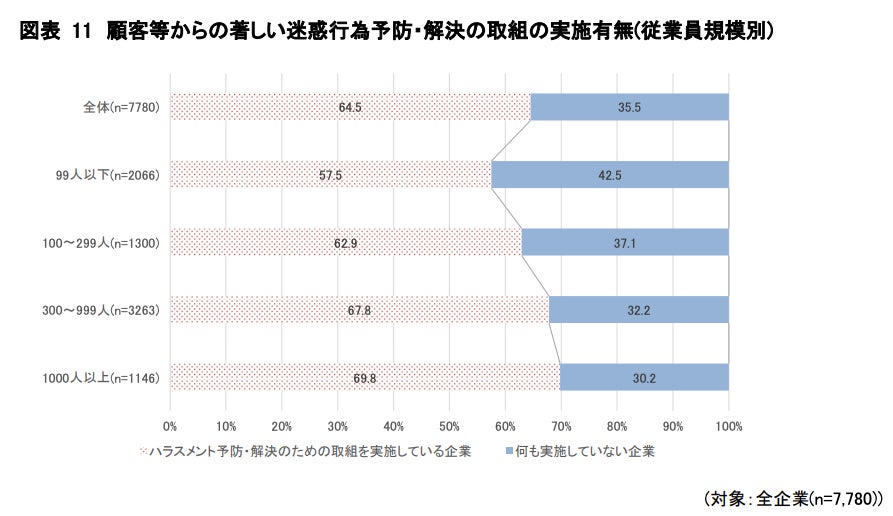 ただ、「令和5年度 厚生労働省委託事業 職場のハラスメントに関する実態調査報告書」によれば、カスハラに対して具体的な対策を講じている企業はどの企業規模においても50%にも満たないという結果が明らかになっています。