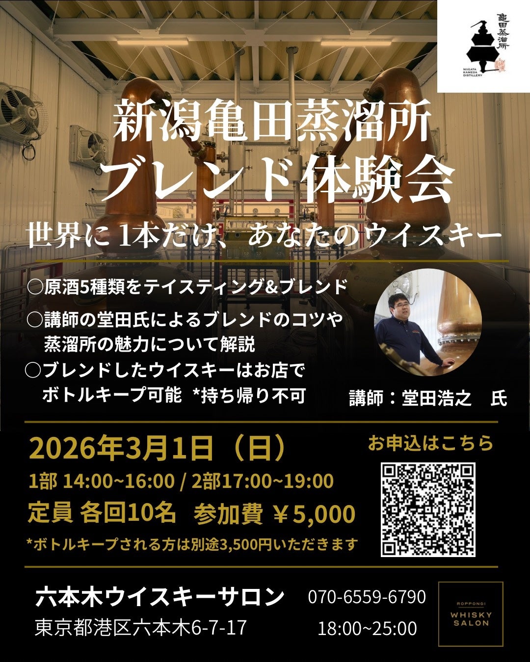 東京・六本木の「六本木ウイスキーサロン(店長:山田)」は、2026年3月1日(日)、国内外で高い評価を受ける「新潟亀田蒸溜所(新潟県新潟市)」の代表・堂田浩之氏を講師に迎え、参加者が自らウイスキーを調合する特別セミナーを開催いたします。作成したウイスキーをそのまま店内にボトルキープできる、体験型ウイスキーイベントの新しい形を提案します。