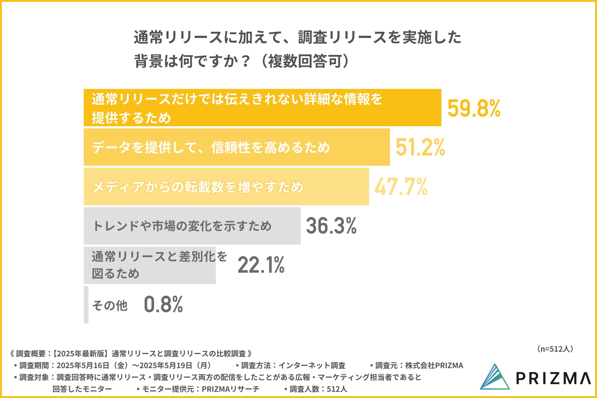 そこで株式会社PRIZMA(https://www.prizma-link.com/press)は、通常リリース・調査リリース両方の配信をしたことがある広報・マーケティング担当者512人を対象に、「2025年最新版 通常/調査リリースの比較調査」を実施しました。